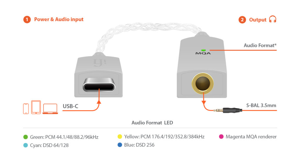 W kwestii parametrów dźwięku, specyfikacja iFi Go Link wskazuje na przetwarzanie plików cyfrowych w rozdzielczości do 32bit/384kHz, w tym DSD do 11,2Mhz (DSD256) oraz MQA. Dioda led na obudowie urządzenia za pomocą komunikatów kolorystycznych wskazuje aktualnie dekodowane formaty audio i częstotliwość próbkowania.