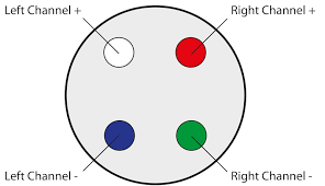 Czerwony – kanał prawy (+) Zielony – kanał prawy (-) Biały – kanał lewy (+) Niebieski – kanał lewy (-)