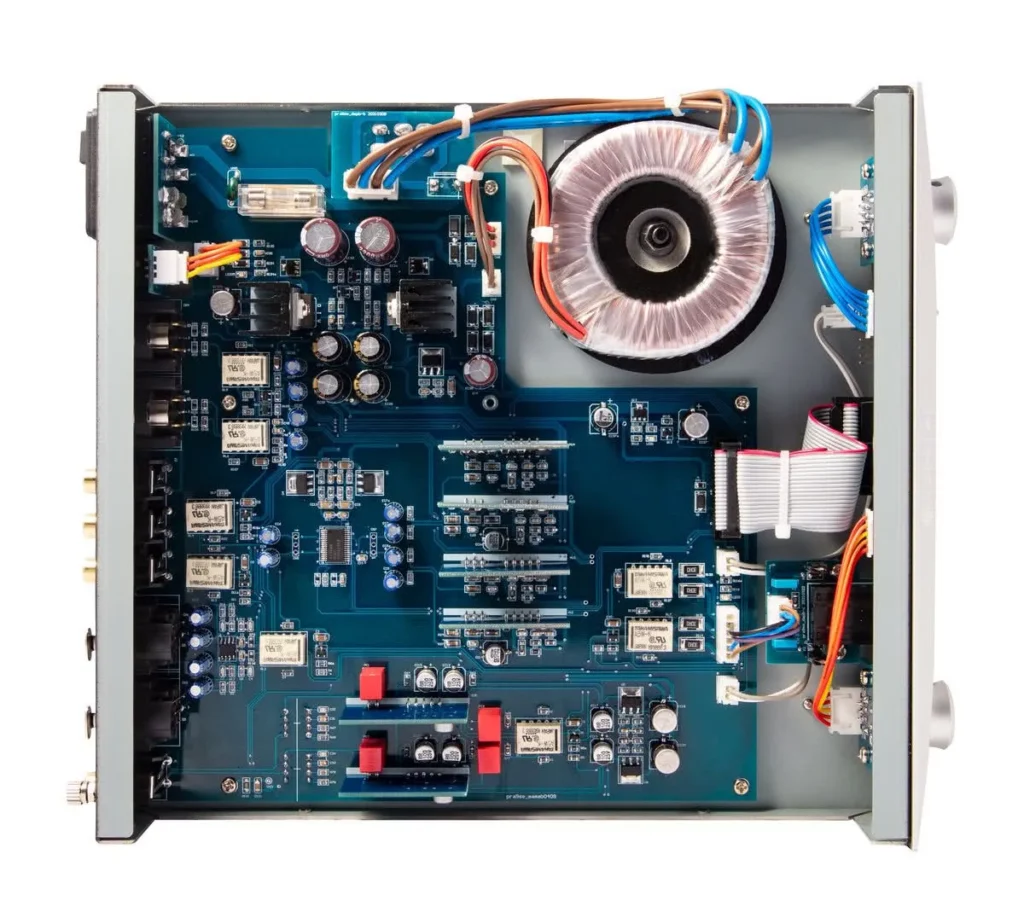 Urządzenie pod aluminiową obudową kryje transformator toroidalny, który również wpływa na obniżenie poziomu zniekształceń. Sam wzmacniacz to dwustopniowy wzmacniacz RIAA, wykorzystujący moduł operacyjny MUSES8820.