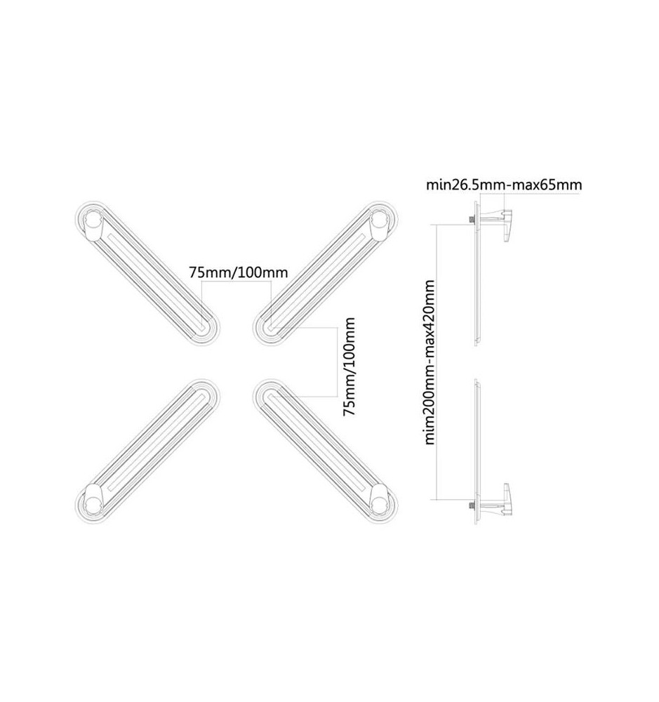 Adapter do monitorów, które fabrycznie nie zostały wyposażone w otwory montażowe w standardzie VESA. Jego zastosowanie umożliwi używanie ekranów z uchwytami w standardzie 75x75 oraz 100x100.