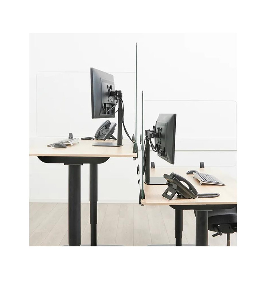 Osłony NS-GLSPROTECT można łatwo przymocować do biurka przy użyciu już dwóch zacisków. Świetnie współpracują także z biurkami o regulowanej wysokości, gdzie bezproblemowo poruszają się razem z nimi. Ekrany ochronne marki Neomount by Newstar można stosować w różnych konfiguracjach zależnie od potrzeb danej organizacji. Mogą być montowane z przodu czy na bokach biurka, aby zapewnić optymalne bezpieczeństwo. Po zainstalowaniu z boku typowego biurka ekran wystaje poza nie, automatycznie tworząc barierę między użytkownikiem a dowolną osobą siedzącą obok.