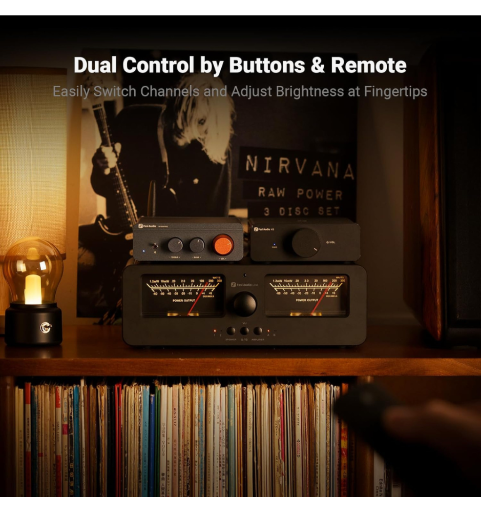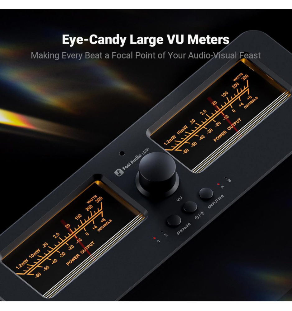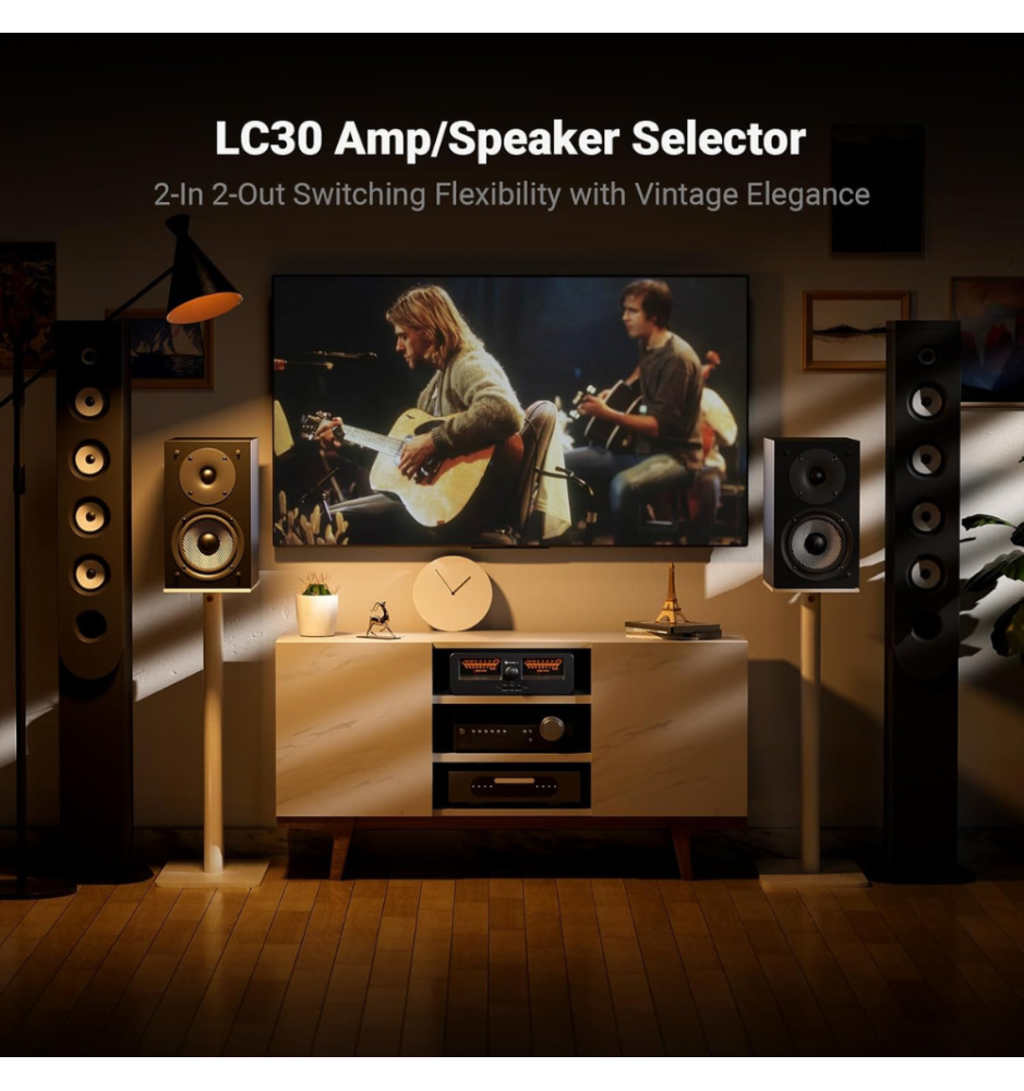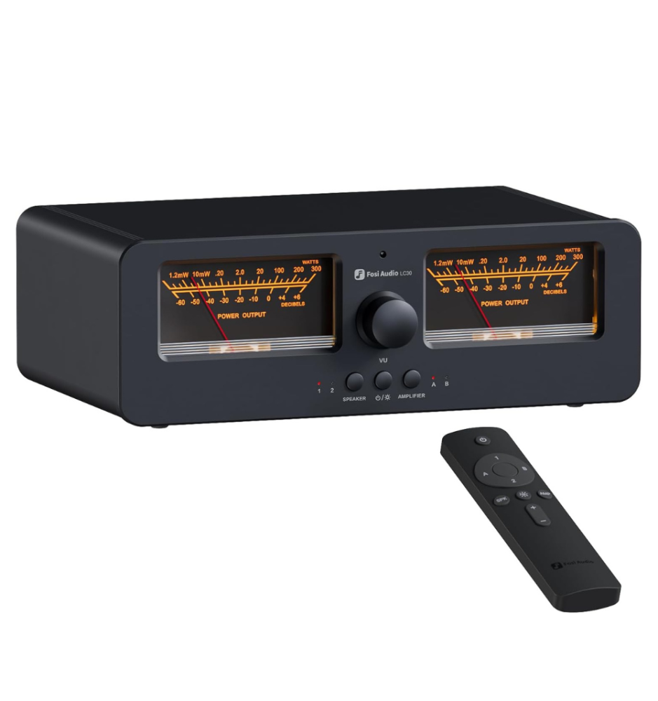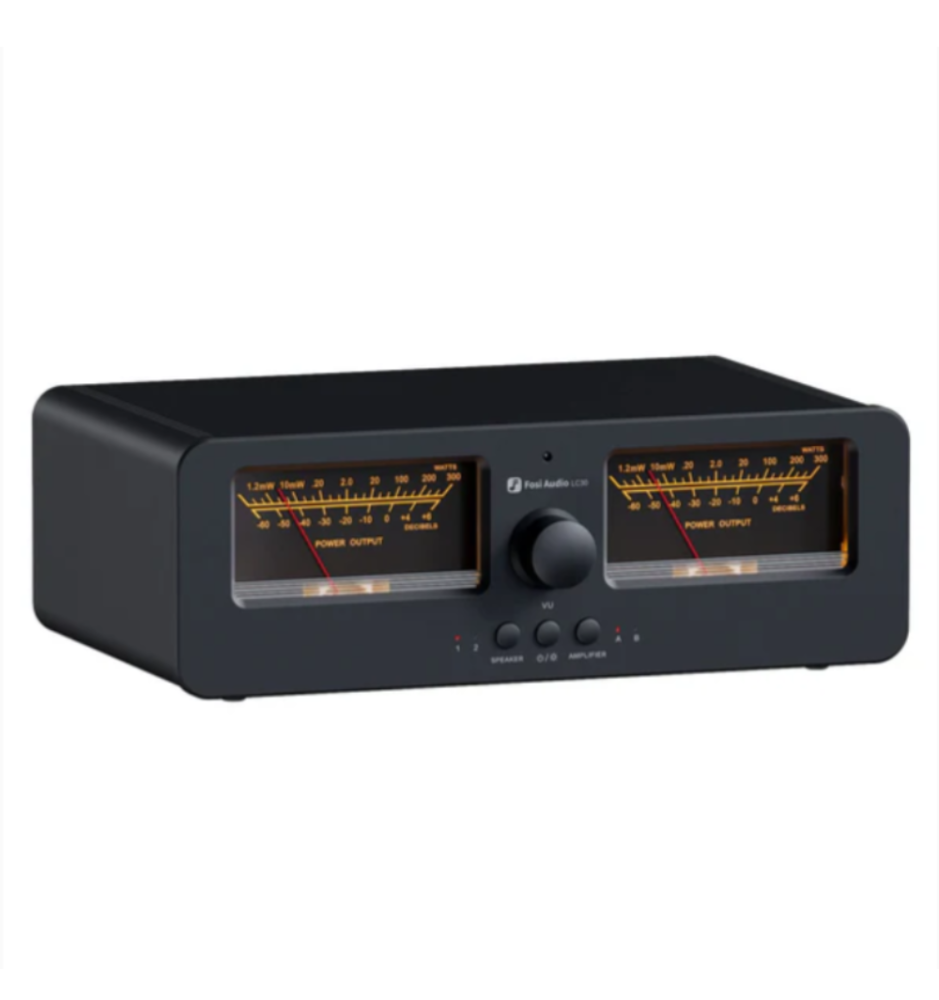 Fosi Audio LC30 to elegancki przełącznik A/B z dużymi, podświetlanymi miernikami VU, który umożliwia błyskawiczne przełączanie między dwoma wzmacniaczami i dwoma parami głośników. Zapewnia kompatybilność z różnymi typami wzmacniaczy, ochronę przed pracą bez obciążenia i przesyła do 250W na kanał przy 4Ω — idealny dla domowych systemów Hi-Fi.