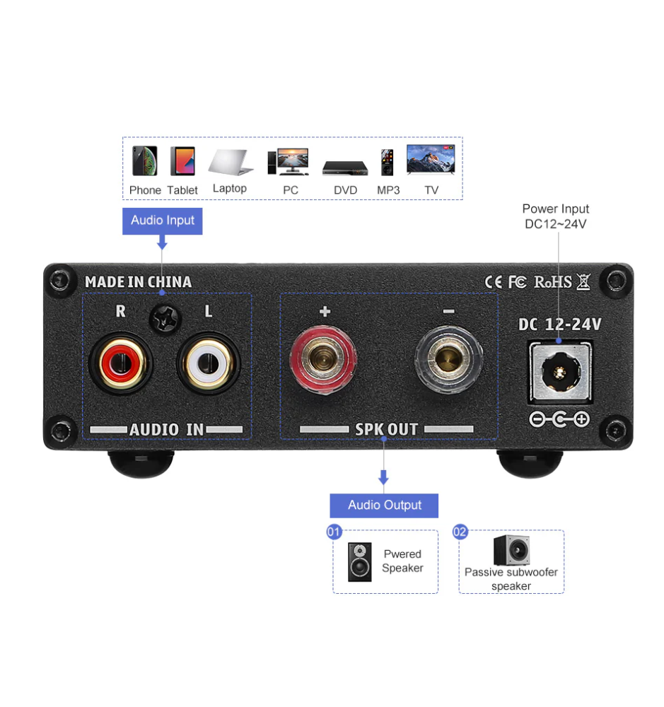 Wzmacniacz AIYIMA A1001 oferuje maksymalną moc wyjściową 100W (1 kanał mono), dzięki czemu bez problemu napędzi nawet wymagające subwoofery. Zasilanie w zakresie DC12–24V (z dołączonym zasilaczem DC19V 4.74A) gwarantuje stabilną i wydajną pracę urządzenia.