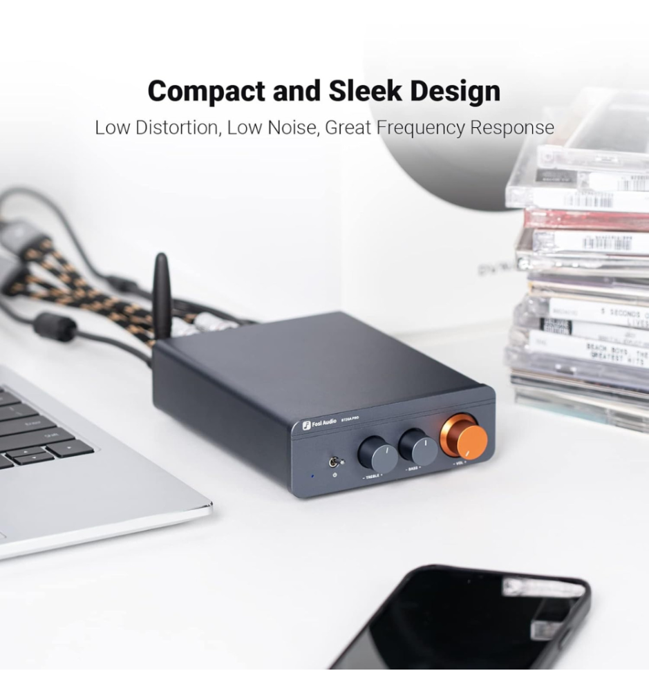 Fosi Audio BT20A Pro Blue to kompaktowy wzmacniacz 600W z chipem TPA3255, Bluetooth 5.0, wymiennymi op-ampami i pełną regulacją basów i sopranów, zapewniający czysty, dynamiczny dźwięk.