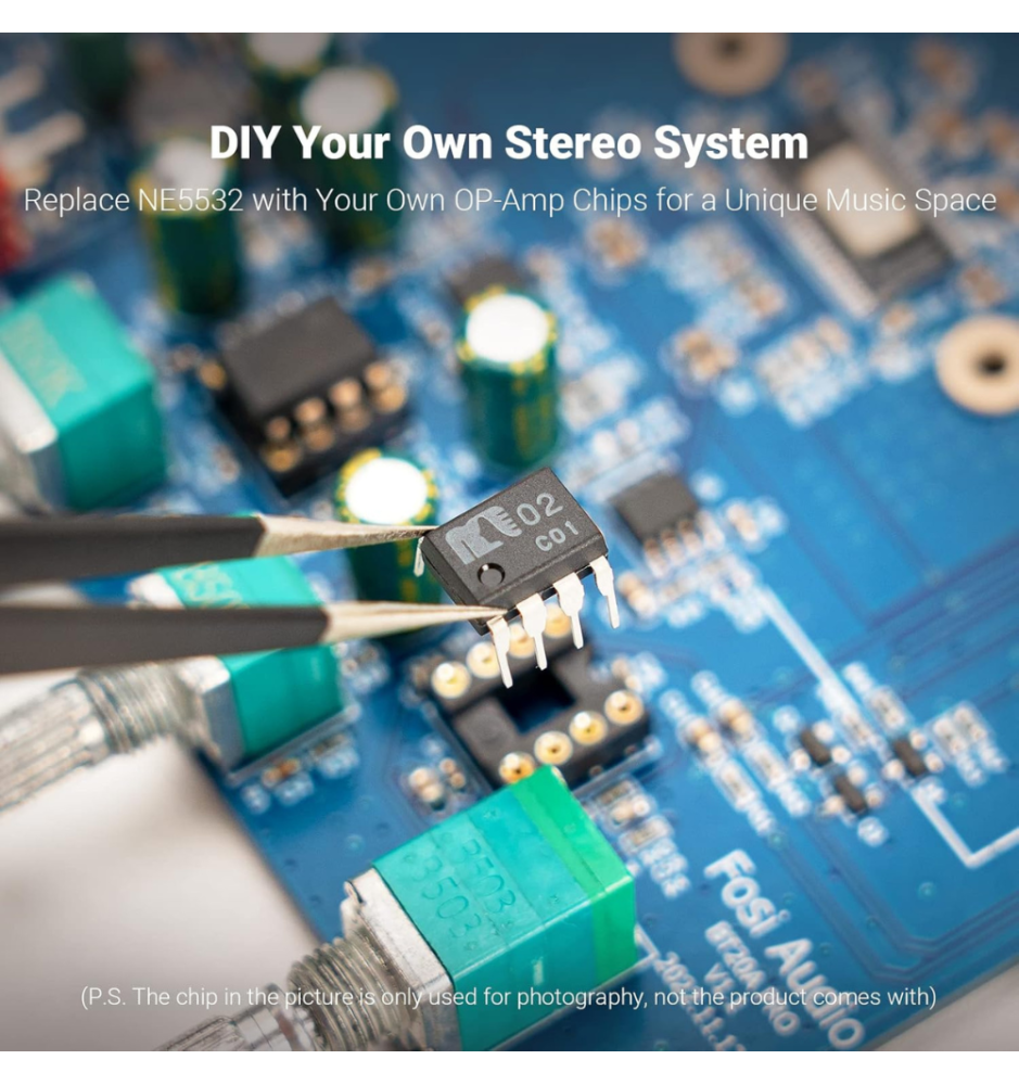 BT20A Pro oferuje doskonałą efektywność energetyczną oraz możliwość wymiany dwóch wbudowanych op-ampów NE5532 na SS3602, MUSES02, OPA2134PA lub OPA2604AP, co pozwala dostosować barwę dźwięku do własnych preferencji. SNR ≥108 dB i THD ≤0,005% gwarantują krystalicznie czysty dźwięk.