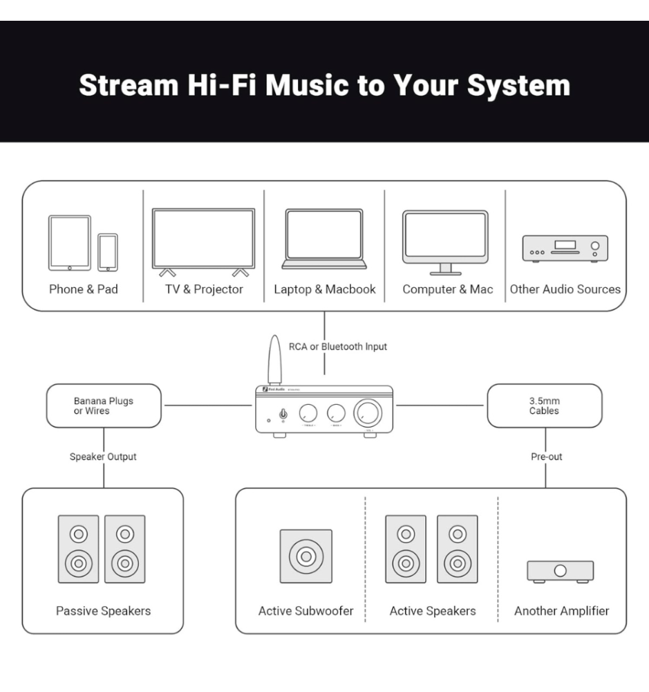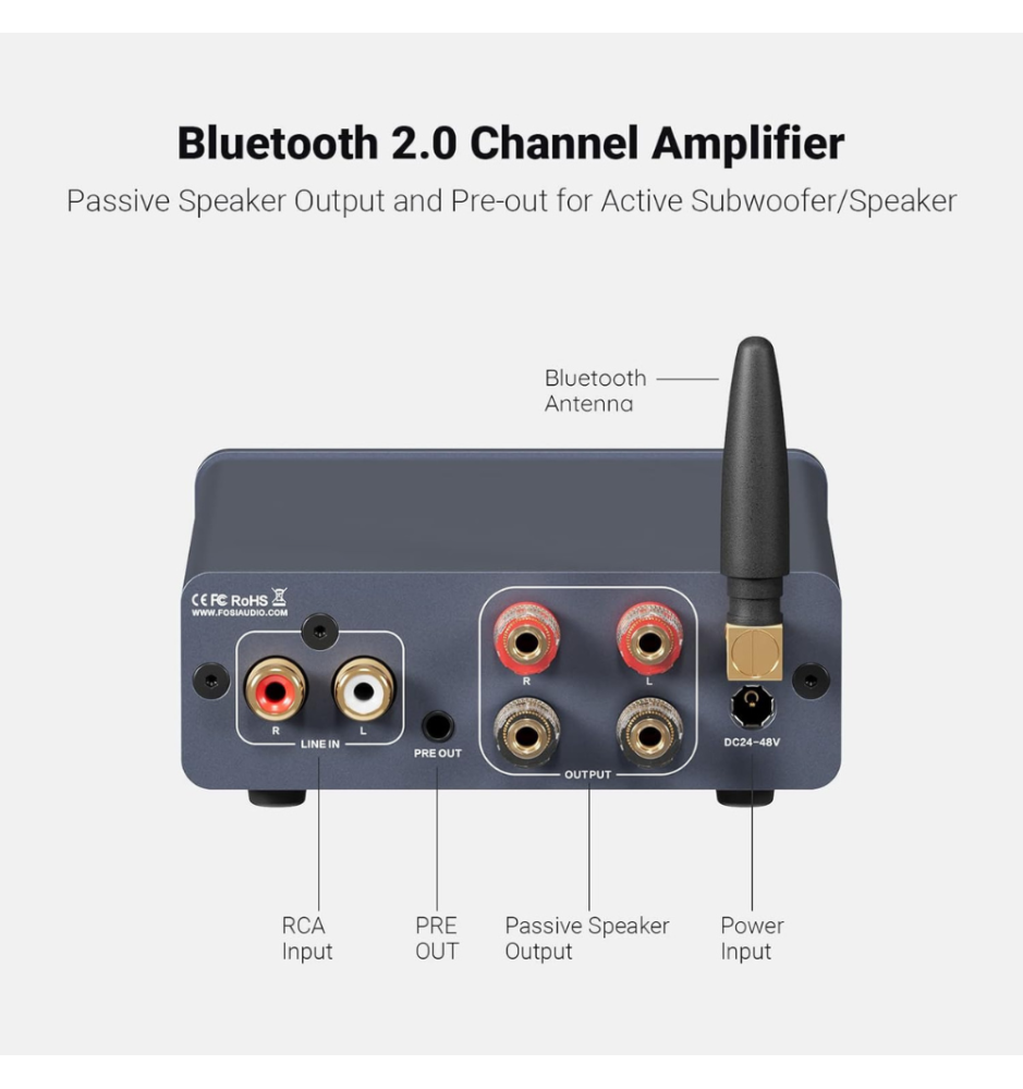 Wzmacniacz obsługuje Bluetooth 5.0 z pamięcią sparowania urządzeń i możliwością szybkiego resetu parowania przytrzymując pokrętło głośności przez 5 sekund. Działa w formatach SBC i AAC, a maksymalny zasięg transmisji sięga do 15 metrów (50 stóp).