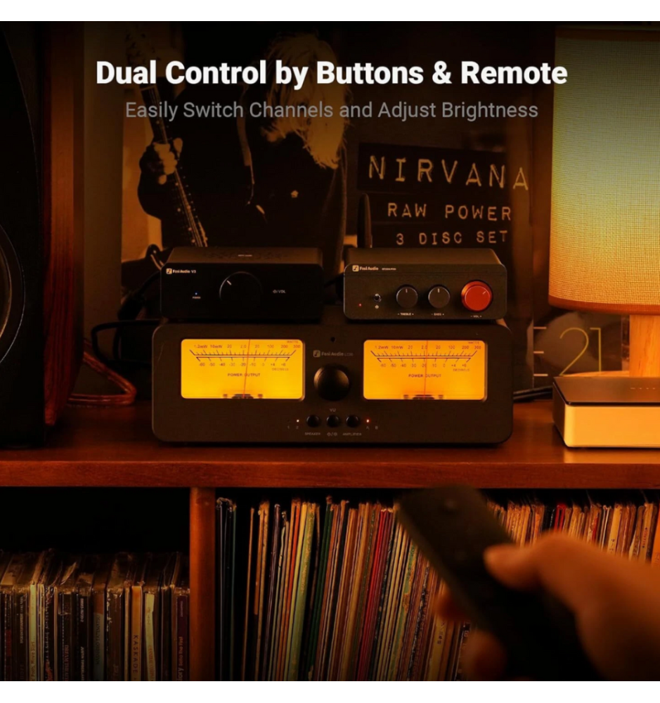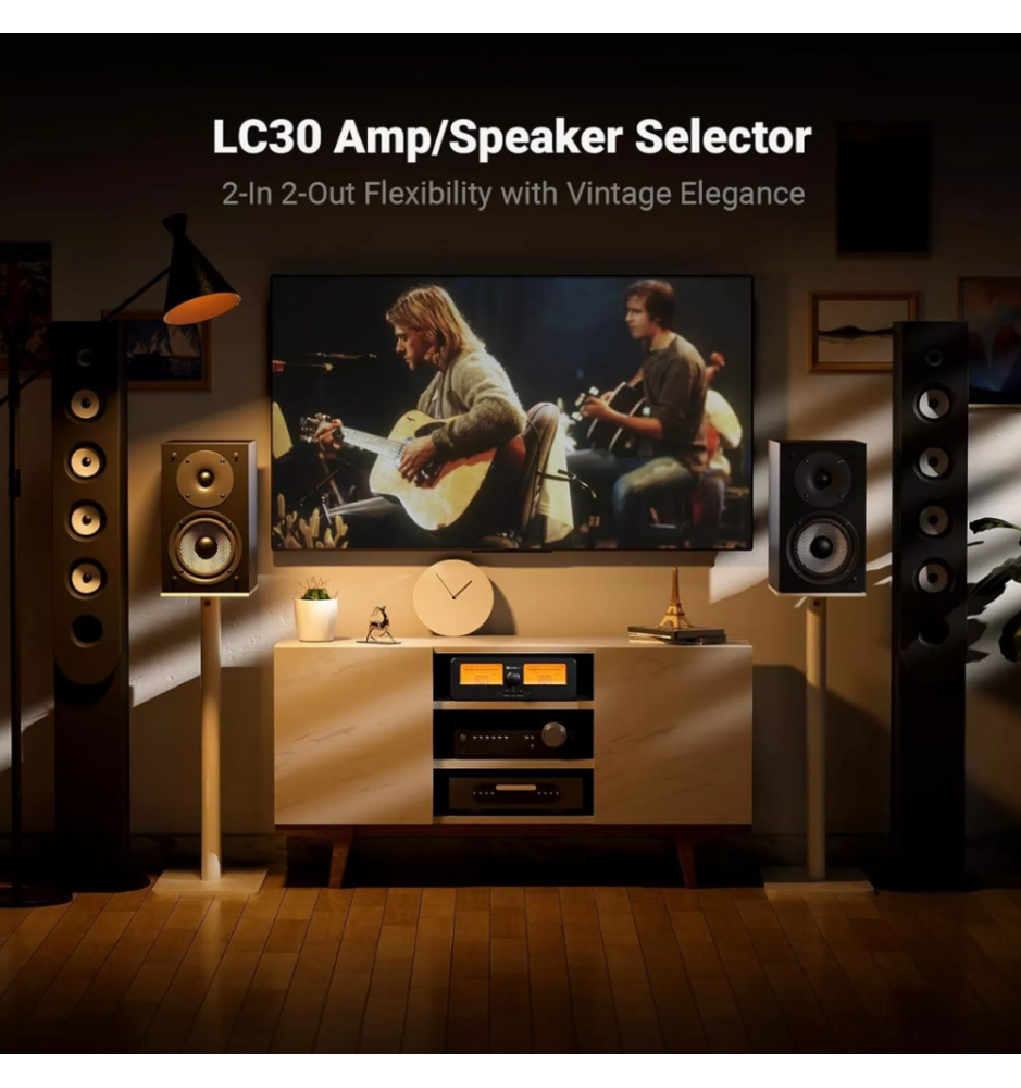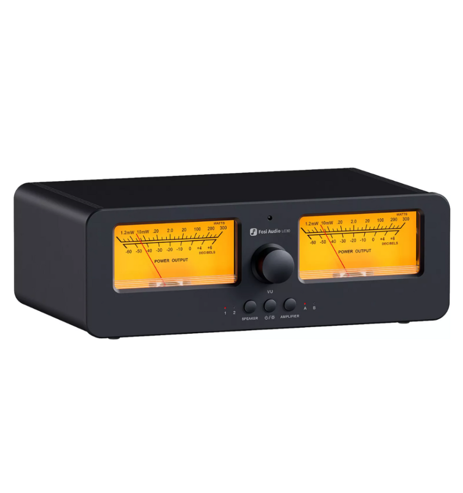 Fosi Audio LC30 to elegancki przełącznik A/B z dużymi, podświetlanymi miernikami VU, który umożliwia błyskawiczne przełączanie między dwoma wzmacniaczami i dwoma parami głośników. Zapewnia kompatybilność z różnymi typami wzmacniaczy, ochronę przed pracą bez obciążenia i przesyła do 250W na kanał przy 4Ω — idealny dla domowych systemów Hi-Fi.