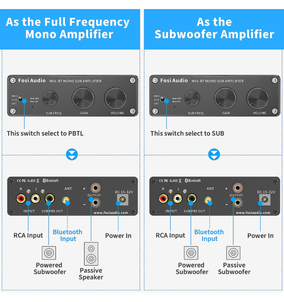 W trybie SUB M01-BT staje się specjalistą do obsługi subwooferów. Pasuje zarówno do pasywnych, jak i aktywnych subwooferów, zapewniając wyraźne, głębokie basy dzięki łatwemu podłączeniu przewodów bananowych lub RCA.