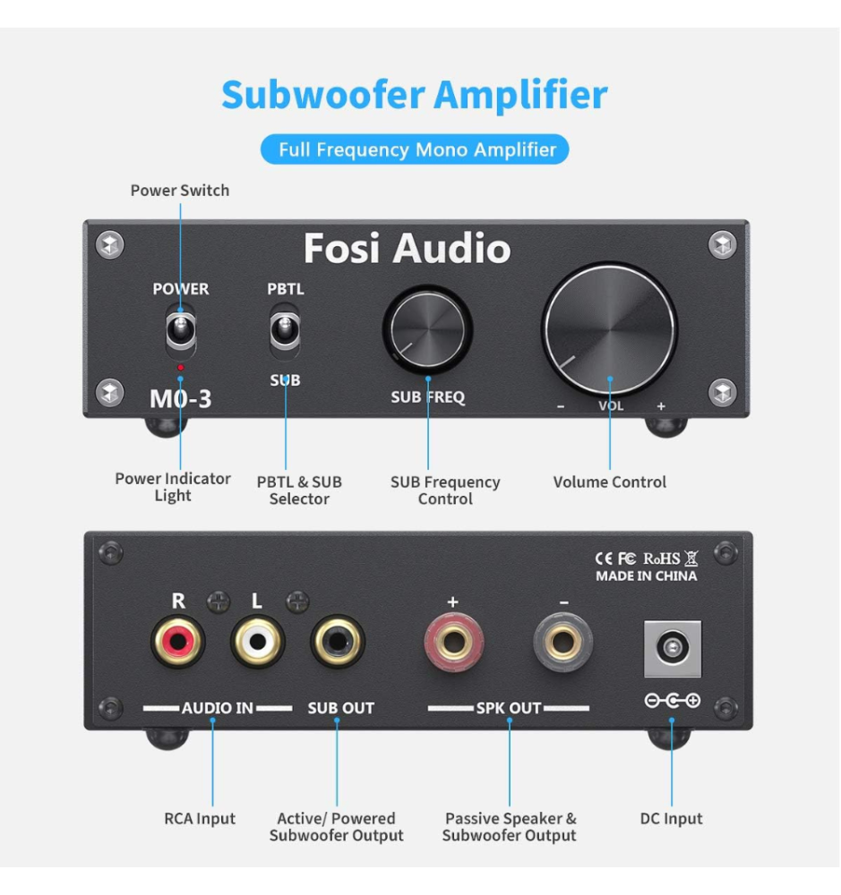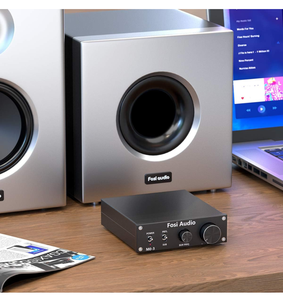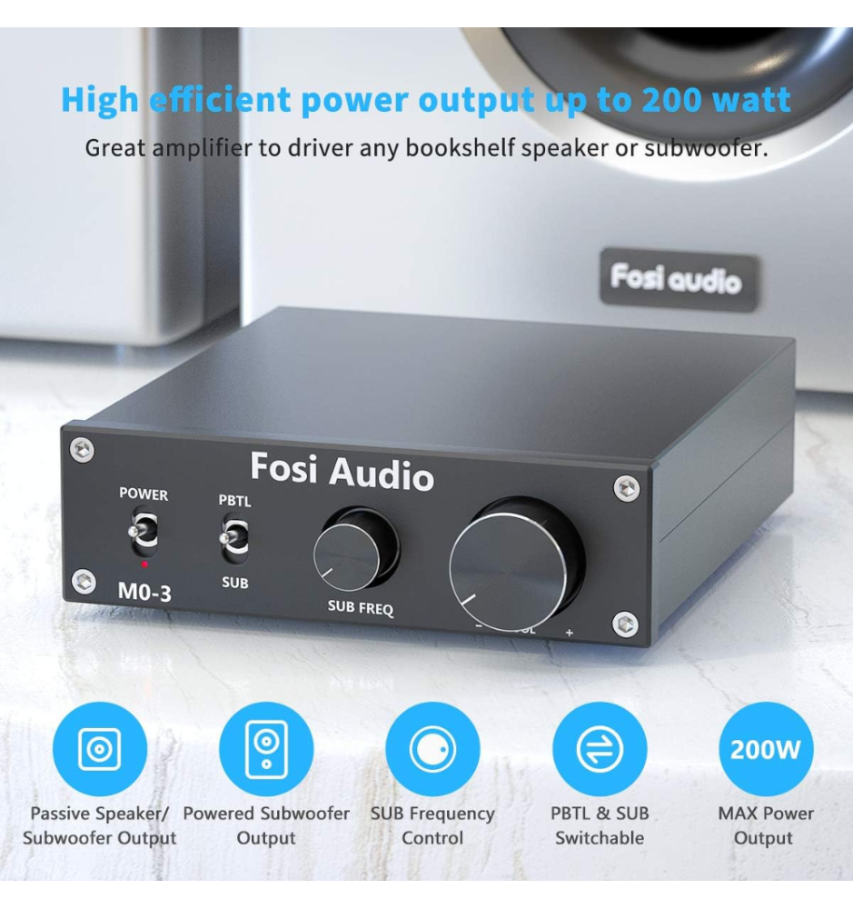 Fosi Audio M03 to kompaktowy, mocny wzmacniacz subwoofera Hi-Fi 200W RMS z czystym dźwiękiem, regulacją basu i szerokim pasmem 20Hz–20kHz.