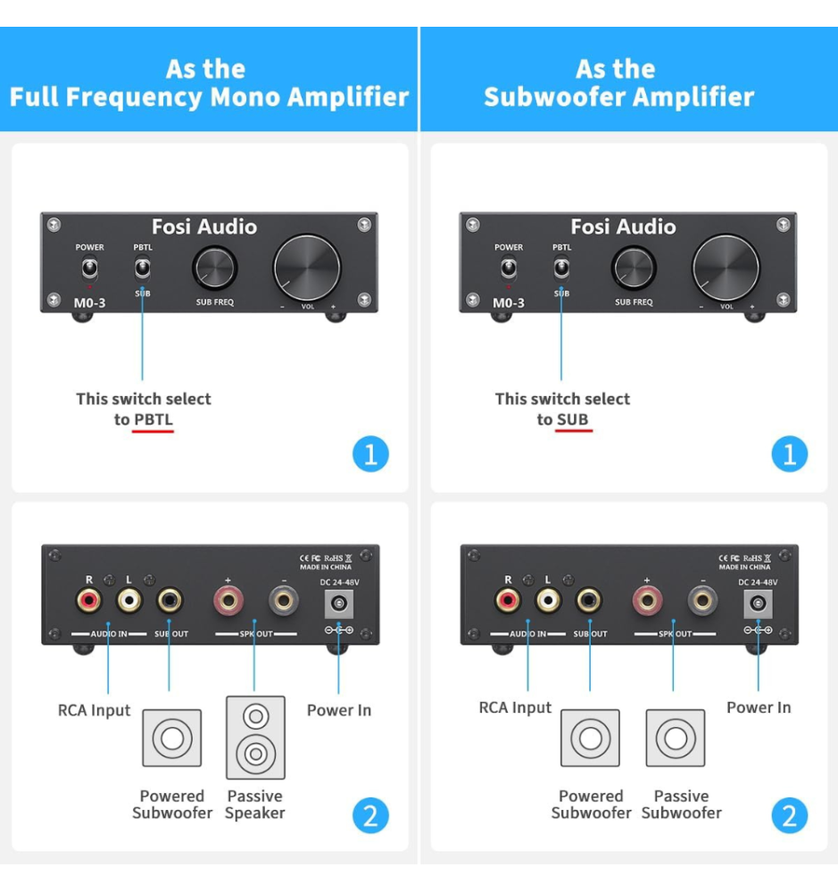 Przełącznik PBTL zamienia wzmacniacz w mono pełnopasmowy do obsługi pasywnych głośników lub subwooferów. Tryb SUB to dedykowany wzmacniacz subwoofera, kompatybilny zarówno z subwooferami pasywnymi, jak i aktywnymi.