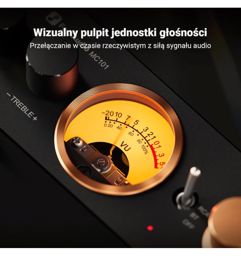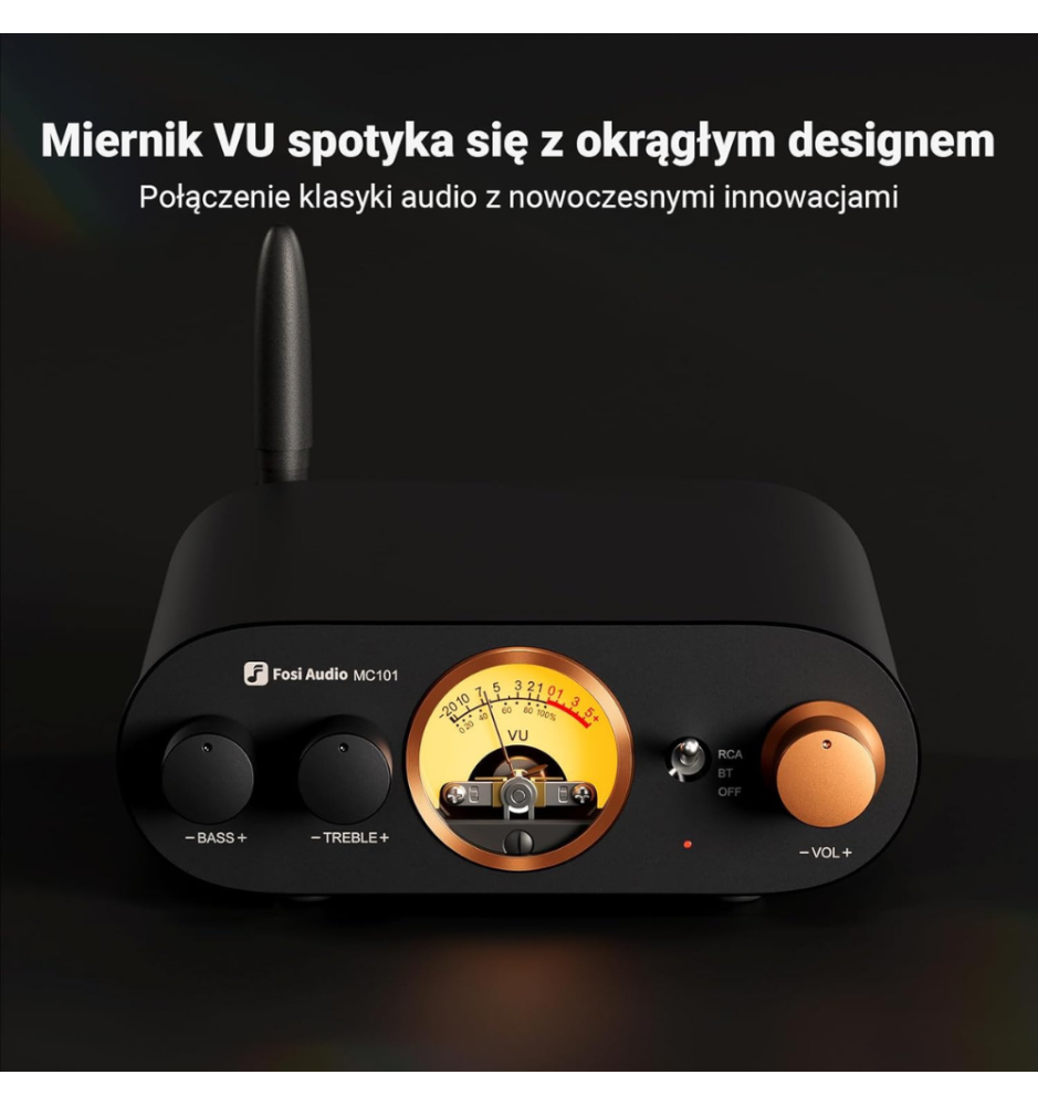 Fosi Audio MC101 to kompaktowy wzmacniacz stereo z Bluetooth 5.3, mocą 2×100W, wskaźnikiem VU i precyzyjną regulacją tonów, łączący styl vintage z brzmieniem Hi-Fi.