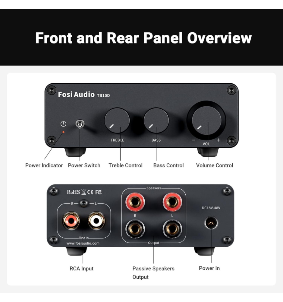 TB10D wykorzystuje klasyczne wejście RCA, dzięki czemu współpracuje z komputerami, odtwarzaczami CD/DVD, telewizorami, laptopami i innym sprzętem audio. To wydajny wzmacniacz 2.0CH, który z łatwością uzupełni każdy domowy zestaw stereo.