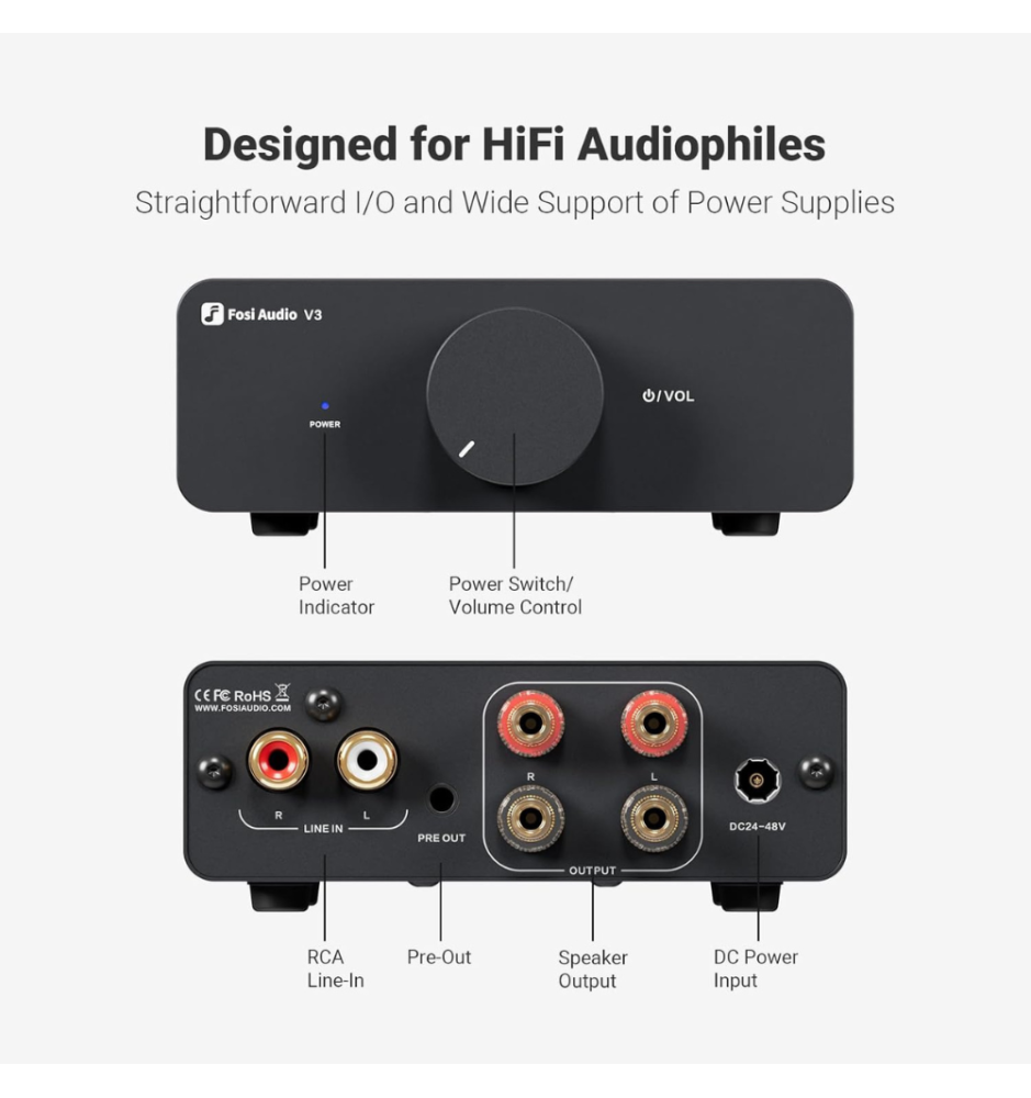 Mimo niewielkich wymiarów (6.5 × 4.1 × 1.4 cala), V3 z łatwością napędza szeroką gamę kolumn pasywnych o impedancji 2–8 Ω. Dzięki wejściu RCA i wyjściu głośnikowemu oraz pre-out doskonale współpracuje z gramofonami, odtwarzaczami CD, DVD czy streamerami, tworząc kompletny system HiFi.