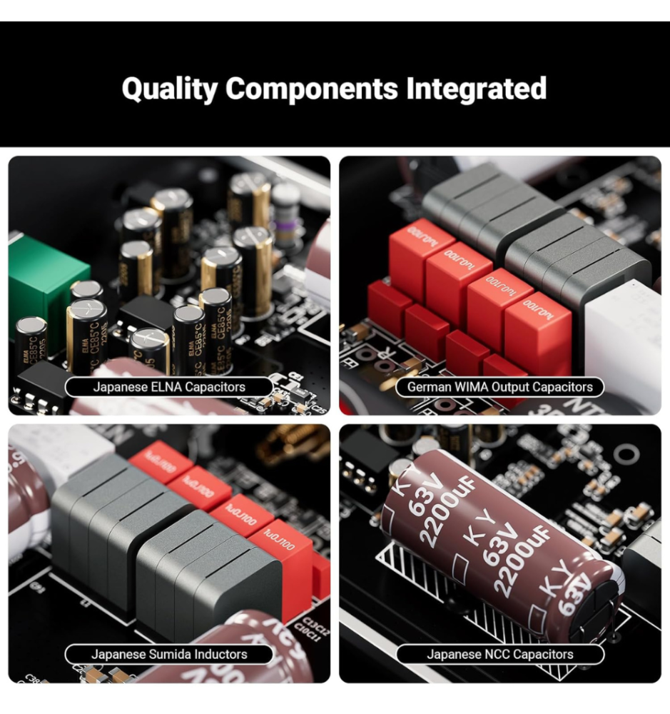 Dzięki wykorzystaniu układu Texas Instruments TPA3255 oraz wysokiej klasy elementów – m.in. induktorów Sumida, kondensatorów NCC, WIMA i ELNA – wzmacniacz utrzymuje niesamowitą stabilność oraz niski poziom zniekształceń THD ≤0.003%. Efekt? Wyjątkowo czysty, przejrzysty i naturalny dźwięk w całym paśmie 20 Hz – 20 kHz.