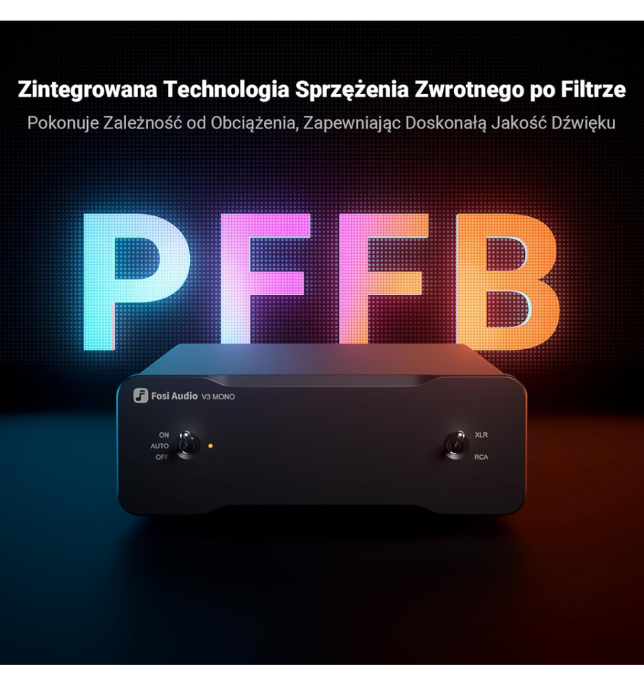 Fosi wprowadza do V3 Mono autorskie rozwiązanie PFFB (Post-Filter Feedback), które kompensuje typowe zależności obciążenia w klasie D. W praktyce oznacza to niższe zniekształcenia, szerszy i bardziej wyrównany zakres przenoszenia oraz lepszą reakcję przy różnych głośnikach.