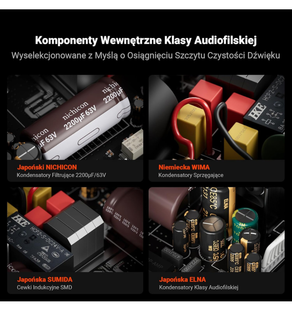 W sercu V3 Mono pracuje układ Texas Instruments TPA3255, a tor zasilają i filtracji oparto na renomowanych elementach: kondensatorach Nichicon i ELNA, kondensatorach WIMA oraz induktorach Sumida. Dzięki temu osiągnięto THD <0.006%, SINAD 101dB (XLR) i SNR ≥123dB — precyzja i czystość brzmienia na poziomie audiofilskim.