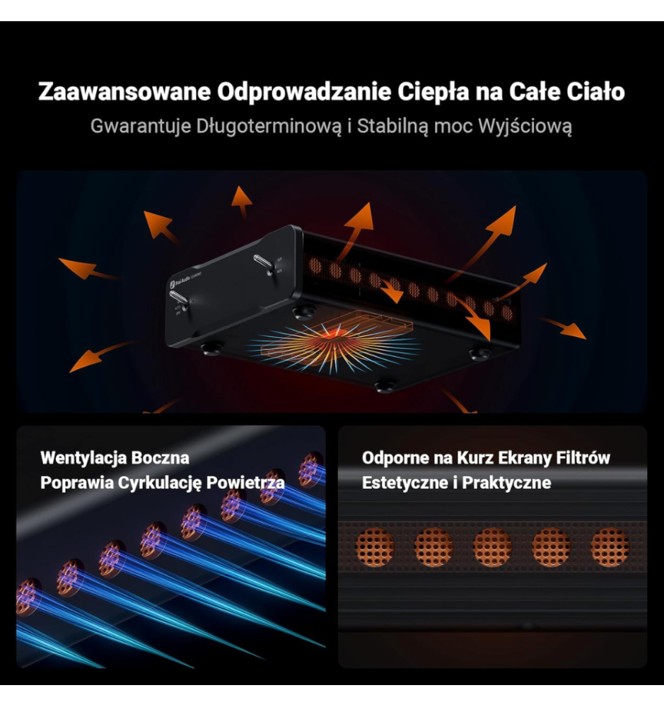 Obudowa V3 Mono pełni funkcję radiatora — układ TPA3255 jest zamocowany u podstawy i zintegrowany z konstrukcją, co wraz z dwoma bocznymi otworami wentylacyjnymi zapewnia skuteczne chłodzenie. Dzięki temu wzmacniacz utrzymuje stabilną, wysoką moc nawet podczas długotrwałego obciążenia.