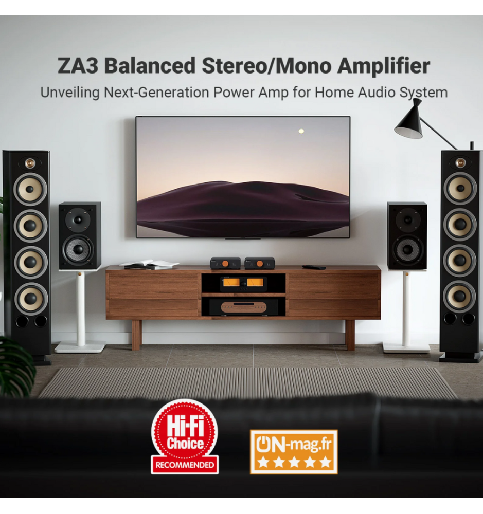 Serce ZA3 stanowi układ Texas Instruments TPA3255 klasy D, wspierany przez kondensatory japońskie NCC i ELNA, niemieckie WIMA oraz induktory Sumida. Dzięki temu uzyskano bardzo niskie zakłócenia i znakomitą jakość: SINAD ≈ 89dB, SNR ≥ 106dB i THD poniżej 0,006%.