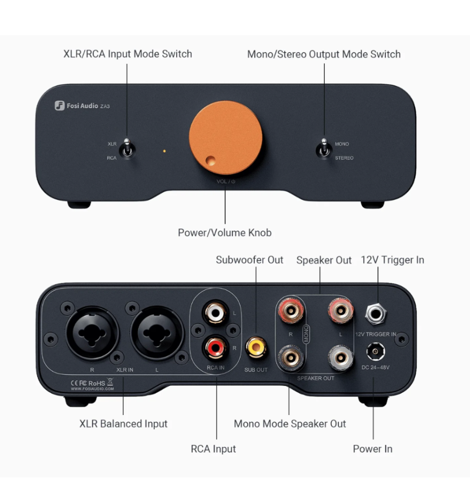 ZA3 to pierwszy model w serii z dedykowanym, zbalansowanym wejściem combo obsługującym XLR i 1/4" TRS, a także standardowe RCA. Dodano gniazdo 12V trigger-in dla wygodnej synchronizacji włączania wraz z innymi urządzeniami, co redukuje konieczność osobnego sterowania sprzętem.