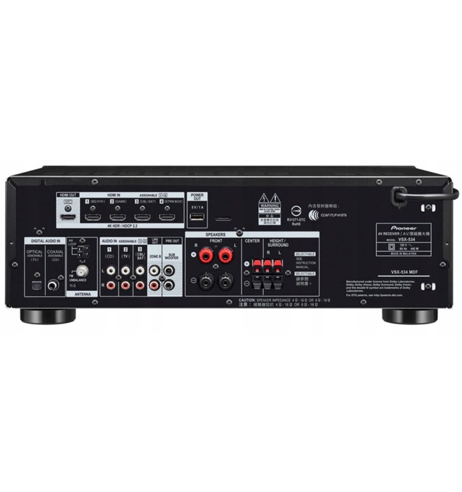 Amplituner jest kompatybilny z konfiguracją 3.1.2ch najnowszej platformy dźwięku kinowego, Dolby Atmos®. Dzięki temu masz możliwość uzyskania dźwięku jakości 3D. VSX-534 obsługuje przejście dla sygnałów HDR10, HLG (Hybrid Log-Gamma) i Dolby Vision a jego wszystkie terminale HDMI obsługują 4K (60p/4:4:4/24-bit). Dzięki HDCP 2.2 nie ma problemu z podłączaniem nowych urządzeń i można również cieszyć się treścią premium, taką jak wideo w formacie 4K z cyfrową ochroną przed kopiowaniem.