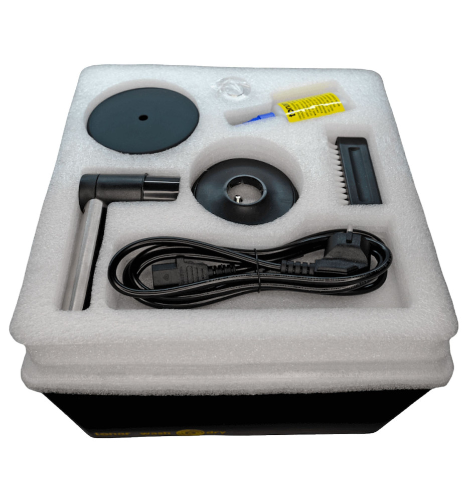 Profesjonalna półautomatyczna myjka przeznaczona do skutecznego i bezpiecznego czyszczenia płyt winylowych we wszystkich popularnych rozmiarach (7", 10" i 12"). Producent do myjki dołącza praktyczne akcesoria, takie jak szczotka z naturalnego koziego włosia do czyszczenia płyt, osłona przeciwpyłowa oraz koncentrat do sporządzenia 1 litra preparatu czyszczącego. Oczyszczone za pomocą myjki Wash & Dry płyty gramofonowe są od razu gotowe do odsłuchu, ponieważ myjka nie tylko czyści, ale również osusza płyty.