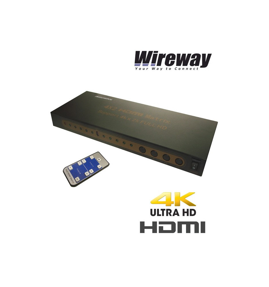 Wireway Matrix HDMI 4/2 to profesjonalny switch - przełącznik sygnału z 4 zupełnie różnych urządzeń na 2 wyświetlacze HDMI, obsługujący pełną zgodność z HDCP oraz najwyższą jakość obrazu Ultra-HD 4K.