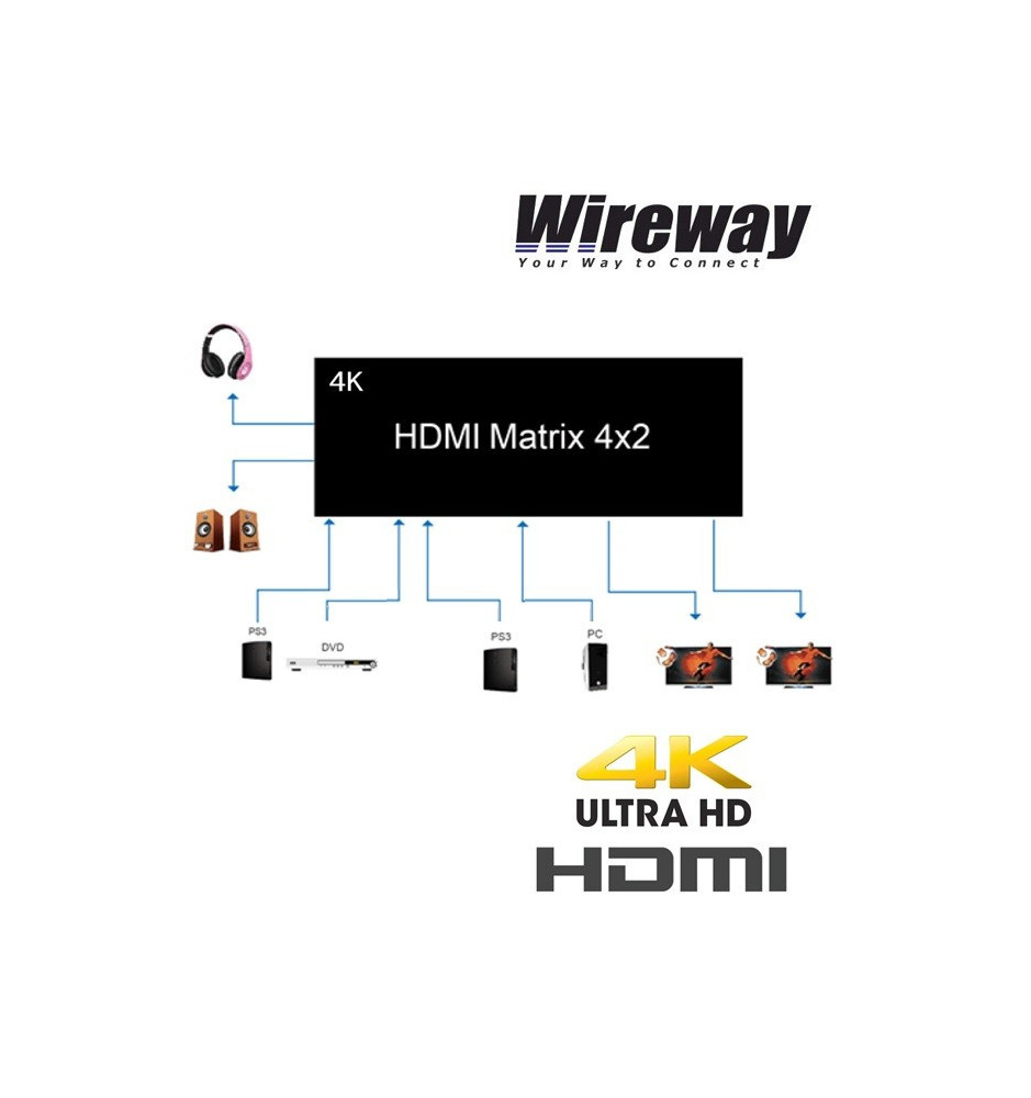 Matrix marki Wireway pozwala na rozdzielenie cyfrowego sygnału HDMI z 4 niezależnych wyświetlaczy / monitorów / telewizorów / projektorów, zapewniając równoczesny przesył obrazu bez utraty najwyższej jakości.