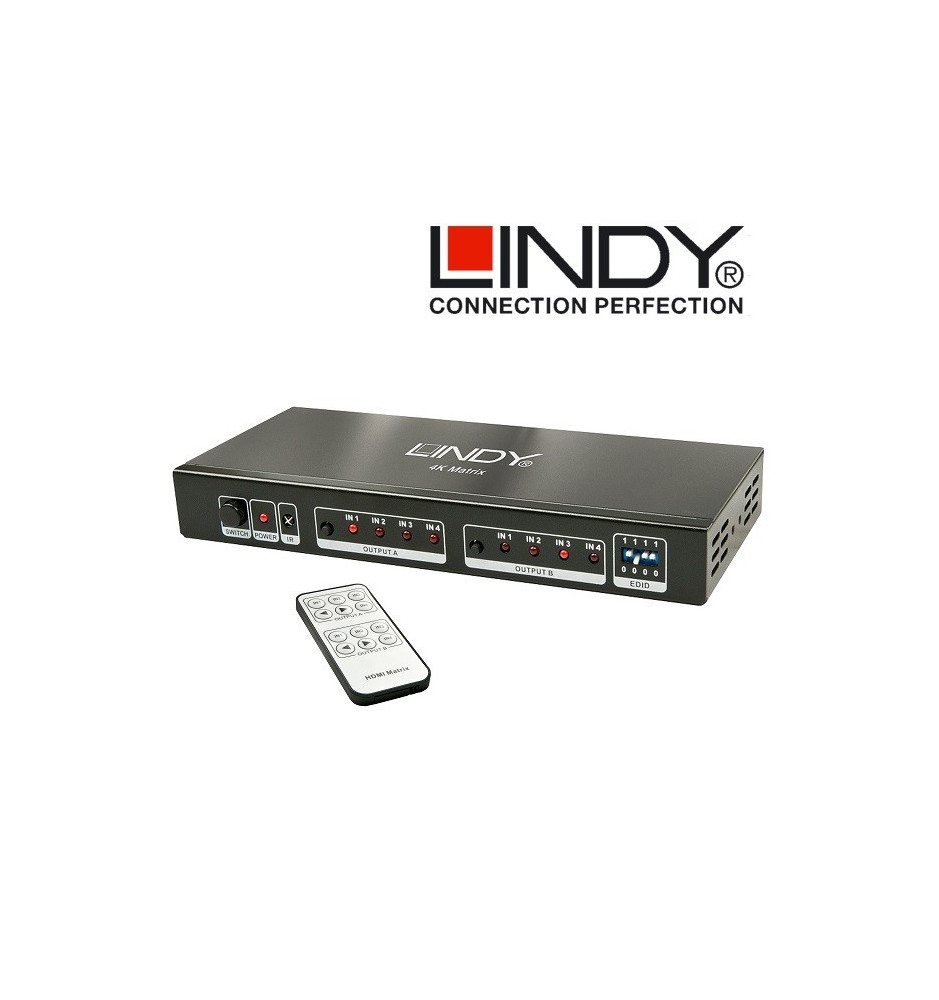 Lindy HDMI Matrix gwarantuje maksimum wygody, możesz podłączyć aż 4 źródła HDMI i wyświetlać je na zmianę na dwóch odbiornikach, obsługując wszystsko dołączonym do zestawu pilotem.