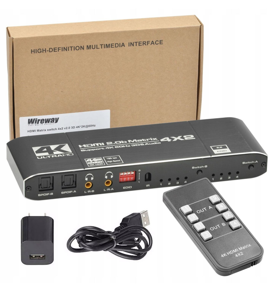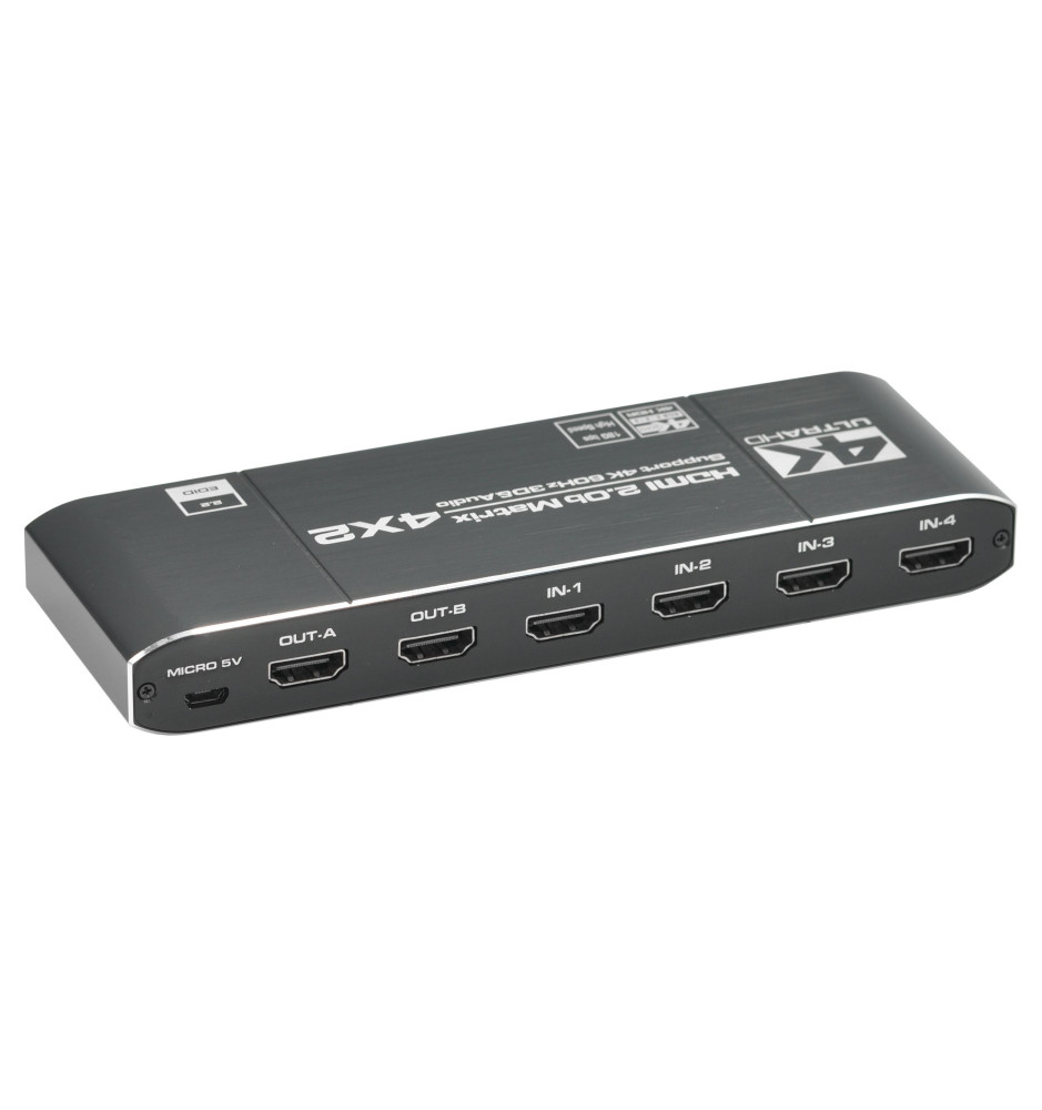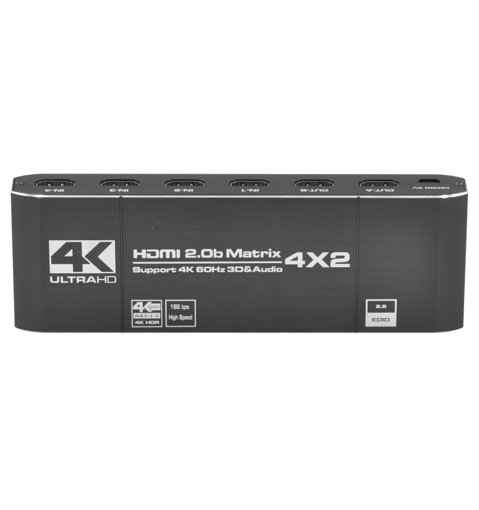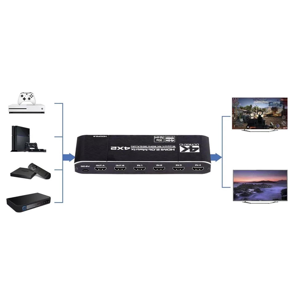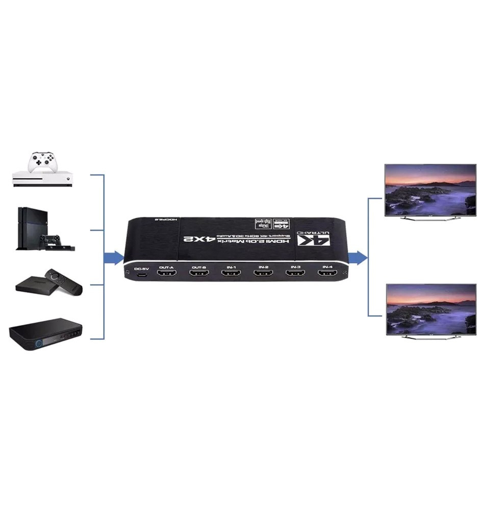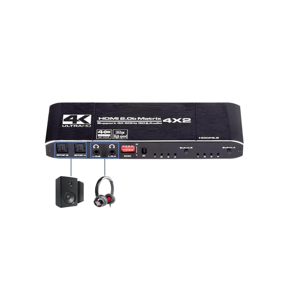 Matrix HDMI 4x2 umożliwia bezstratne podłączenie 4 różnych źródeł sygnału 4K/60Hz poprzez HDMI do dwóch wyświetlaczy ze złączem HDMI, jednocześnie przesyłając sygnał audio poprzez cyfrowe złącza SPDIF lub słuchawkowe 3.5mm jack.
