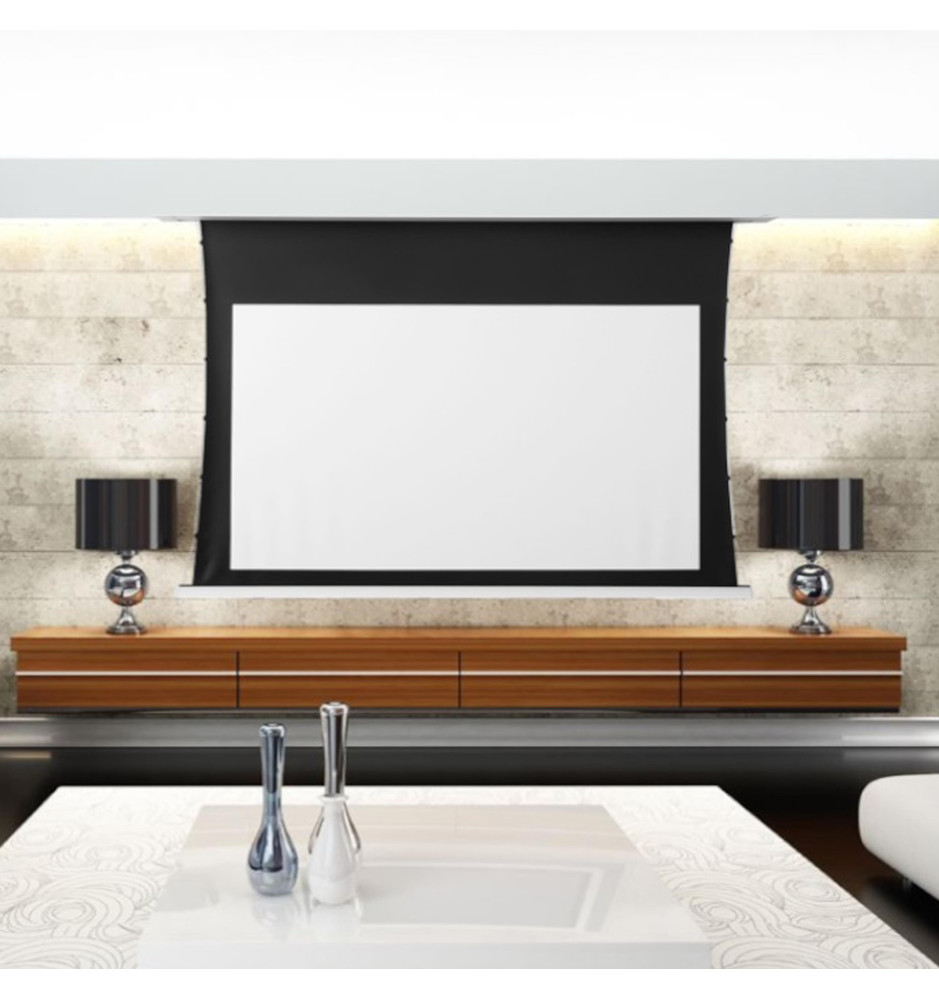 Wytrzymały materiał gwarantuje najwyższą jakość reprodukcji wyświetlanego obrazu, a jego powierzchnię można czyścić za pomocą delikatnych detergentów. System napinaczy bocznych sprawia, że powierzchnia ekranu pozostaje idealnie gładka i sztywna. Czarne obramowanie podkreśla kontrast i ułatwia kalibrację. Górny pas rozbiegowy pozwala na idealne dopasowanie położenia powierzchni projekcyjnej.