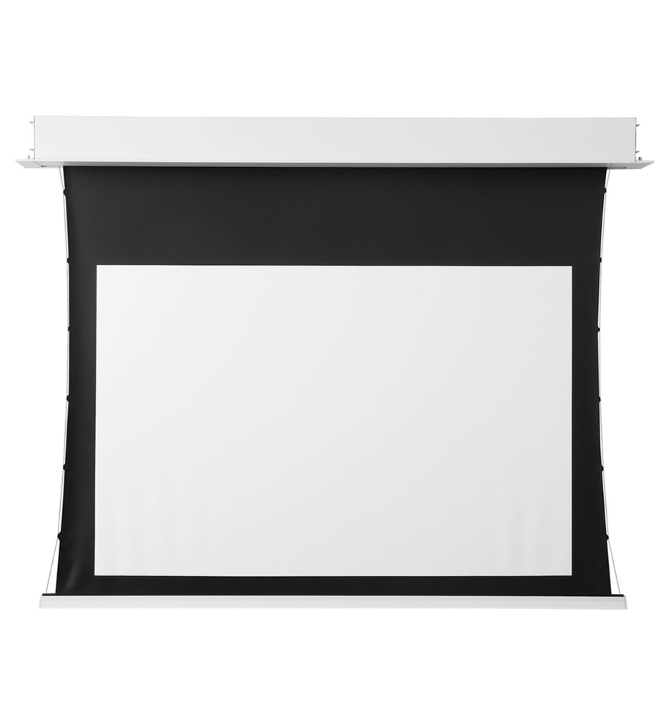 Wytrzymały materiał gwarantuje najwyższą jakość reprodukcji wyświetlanego obrazu, a jego powierzchnię można czyścić za pomocą delikatnych detergentów. System napinaczy bocznych sprawia, że powierzchnia ekranu pozostaje idealnie gładka i sztywna. Czarne obramowanie podkreśla kontrast i ułatwia kalibrację. Górny pas rozbiegowy pozwala na idealne dopasowanie położenia powierzchni projekcyjnej.