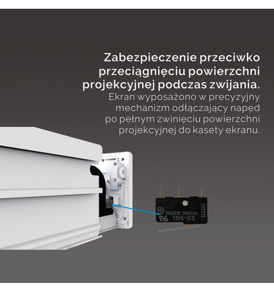 Ekran Polaris Pro White wyróżnia się niewielką głębokością montażową. Opatentowany system sprężynowego dociskania sprawia, że dolna belka obciążeniowa idealnie dopasowuje się do panelu ekranu. Precyzyjny mechanizm odłączający napęd po pełnym zwinięciu powierzchni projekcyjnej chroni ją przed przeciągnięciem podczas zwijania.