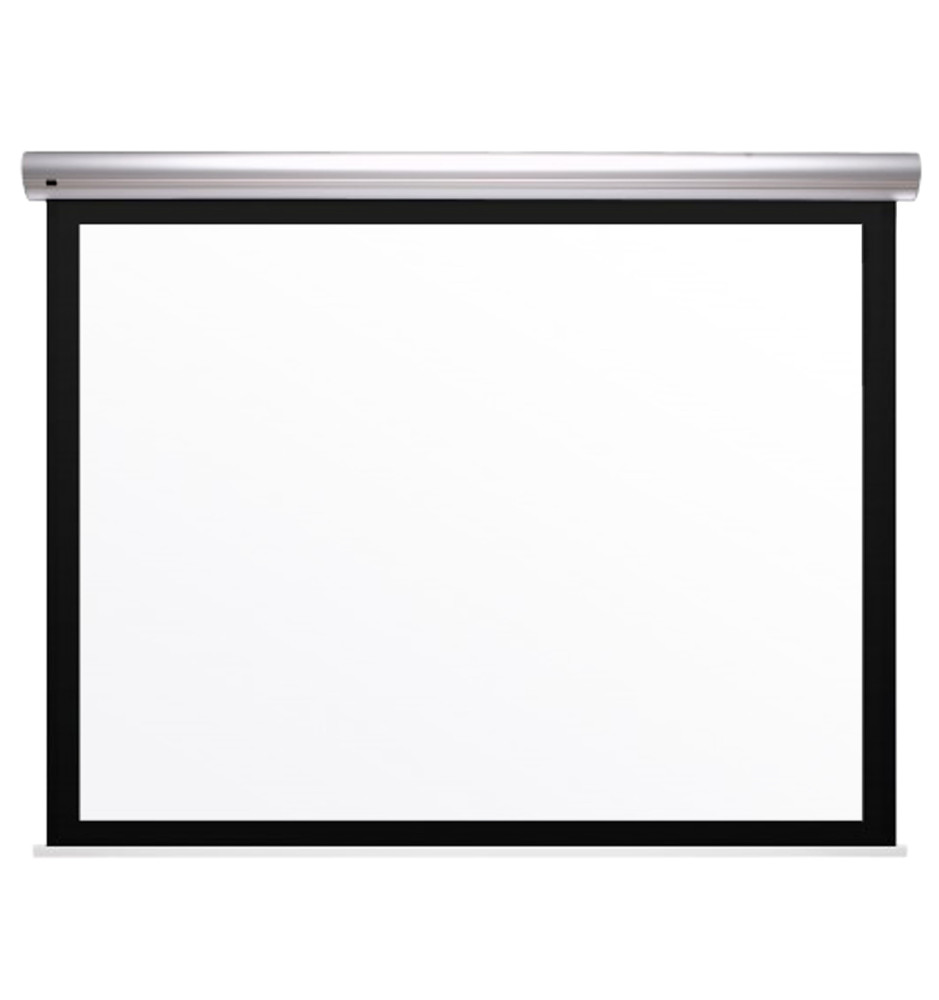 Elektrycznie rozwijany ekran projekcyjny polskiej firmy Kauber z serii Blue Label Black Frame, idealny do biur, sal konferencyjnych, szkół, kina domowego oraz auli wykładowych.