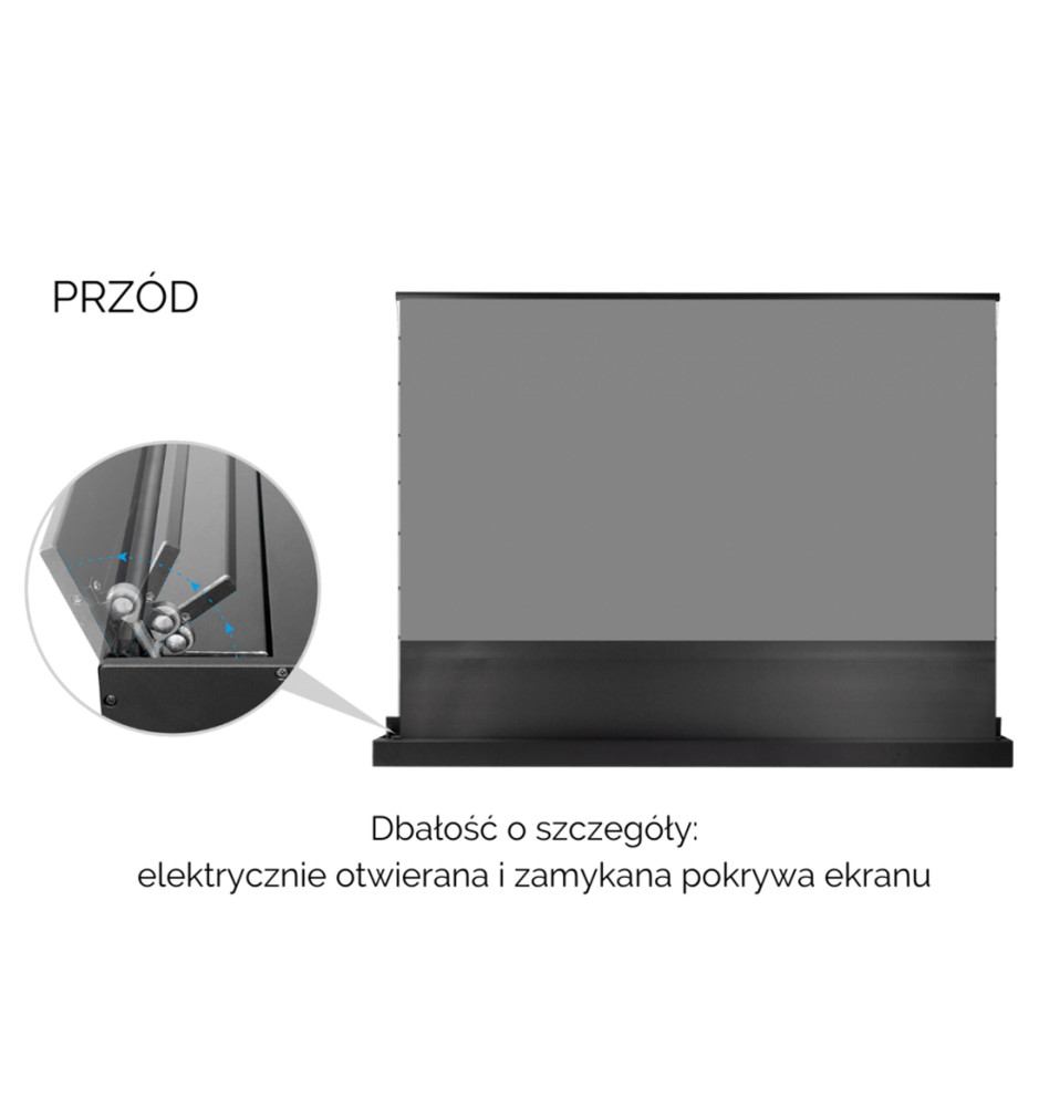 Wytrzymały materiał gwarantuje najwyższą jakość reprodukcji wyświetlanego obrazu, a jego powierzchnia może być czyszczona dołączoną szczotką lub za pomocą delikatnych detergentów. System napinaczy bocznych sprawia, że powierzchnia ekranu pozostaje idealnie gładka i sztywna. Czarny pas rozbiegowy u dołu ekranu pozwala na idealne dopasowanie położenia powierzchni projekcyjnej.
