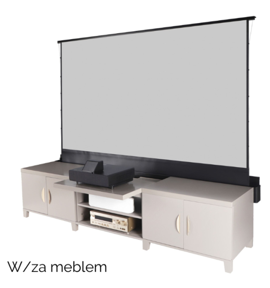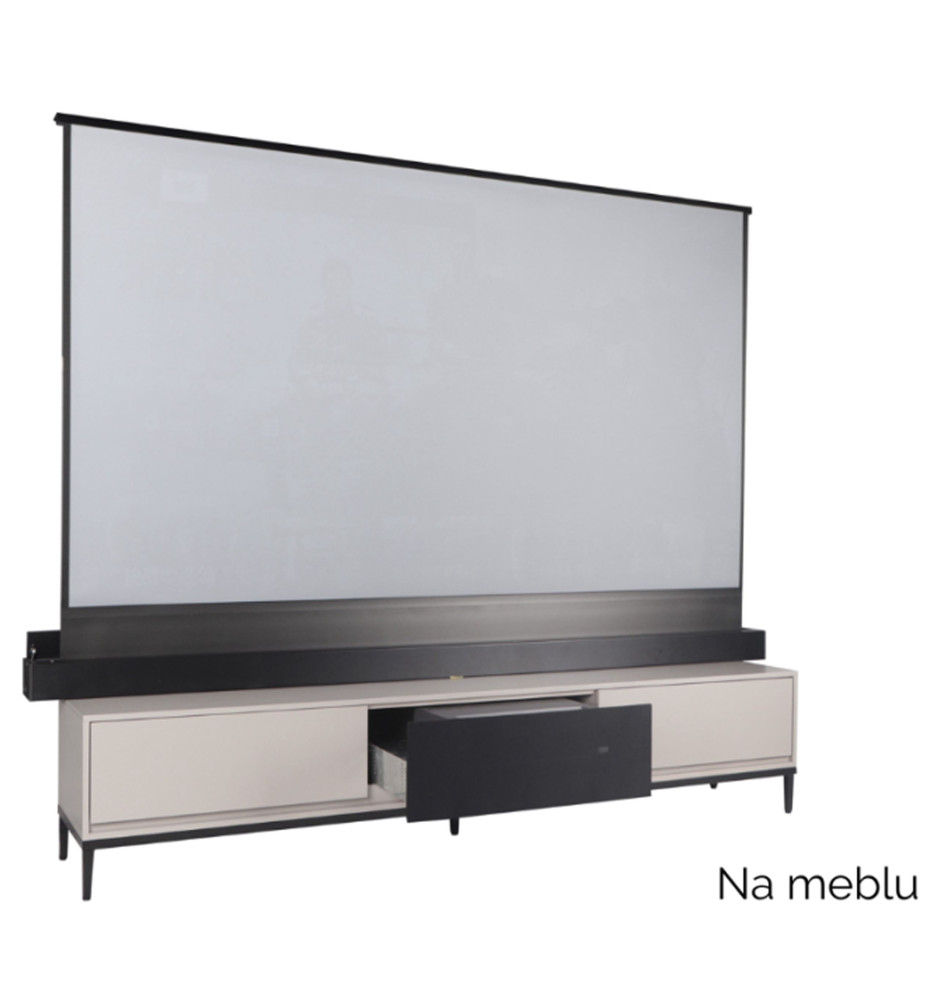 Przenośny, elektrycznie rozwijany ekran projekcyjny z możliwością instalacji meblowej.