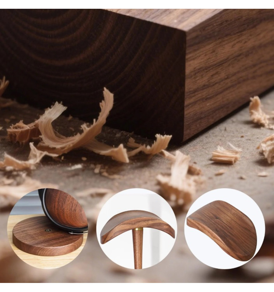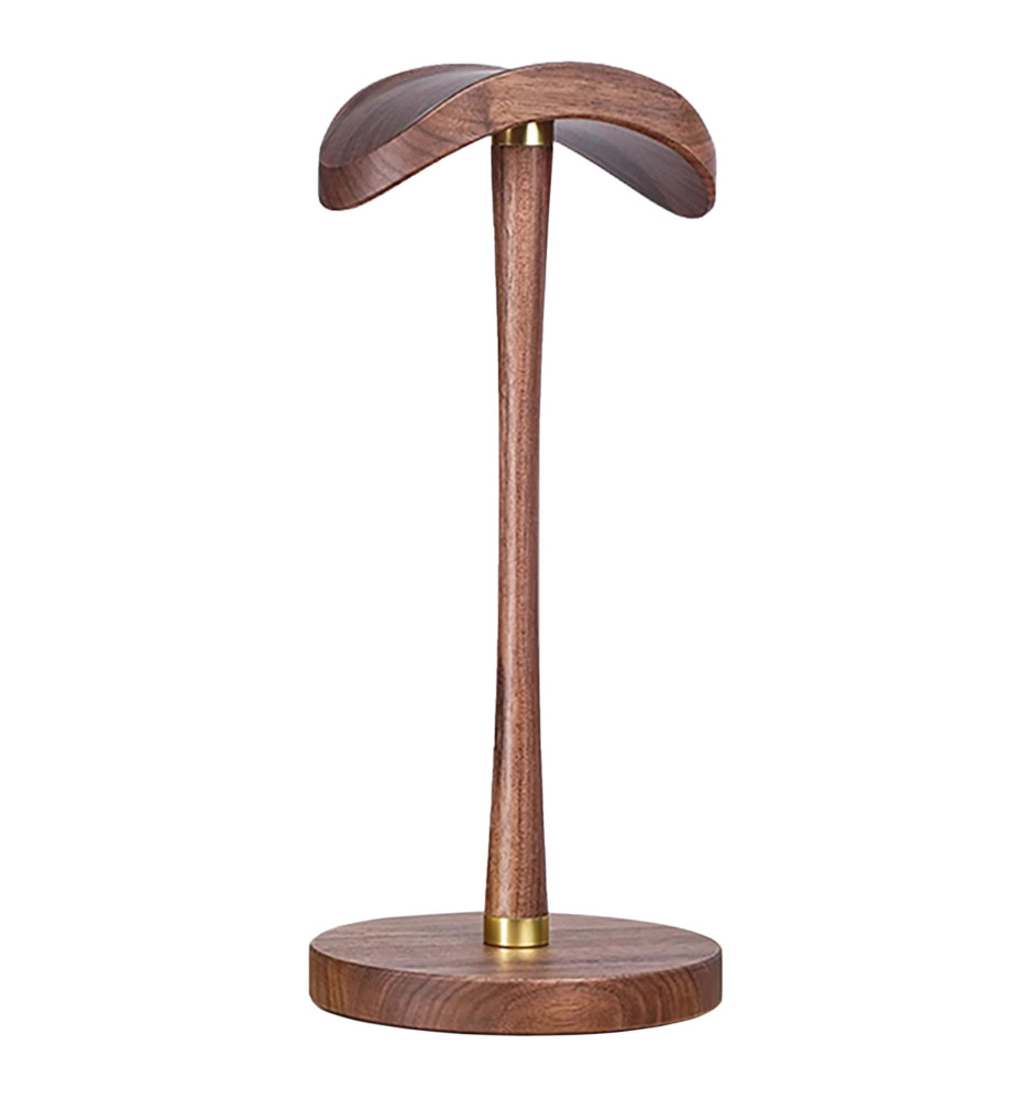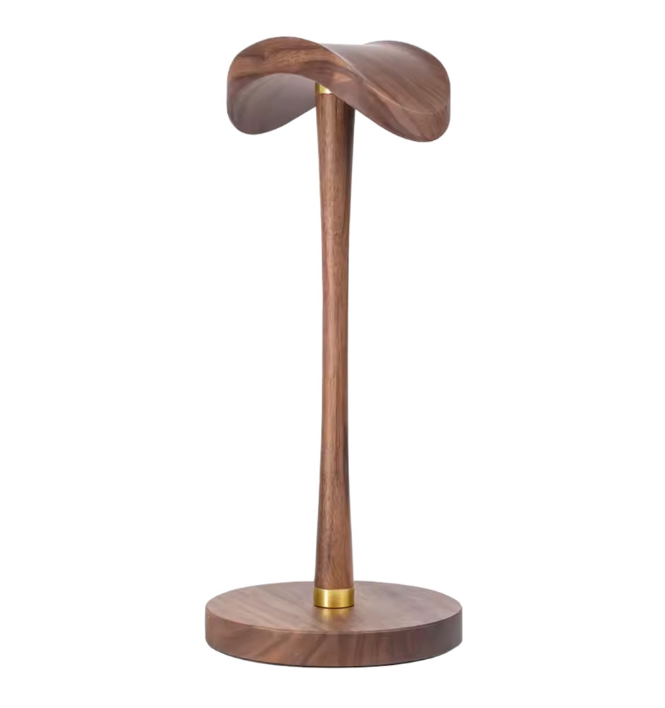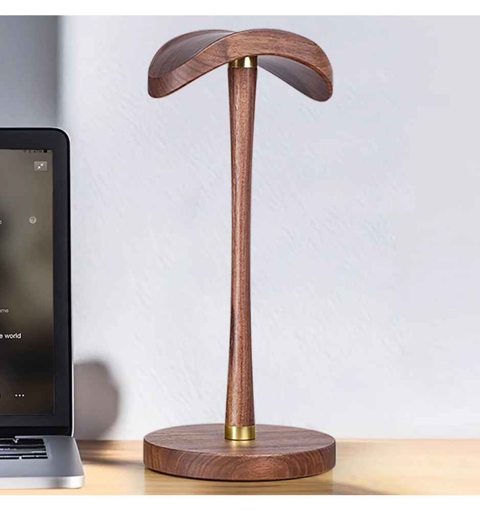 Uniwersalny i stylowy stojak biurkowy na słuchawki, wyróżniający się składaną konstrukcją w całości wykonaną z litego drewna orzechowego, podstawą z podkładką antypoślizgową oraz profilowaną podporą w kształcie łuku, chroniącą pałąk słuchawek przed deformacją.