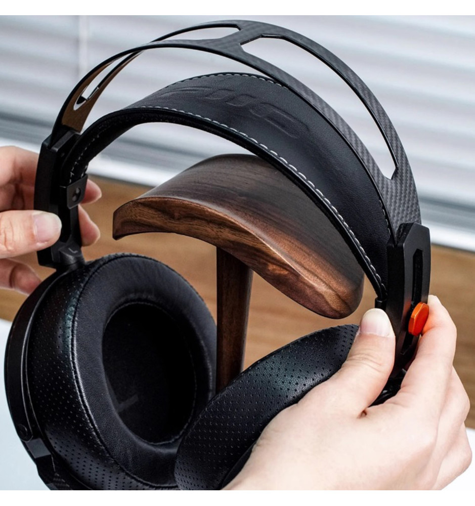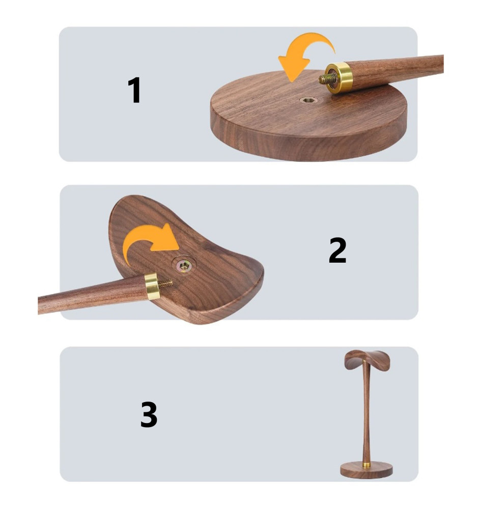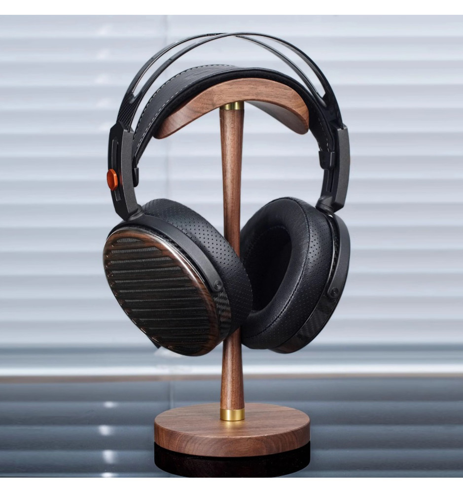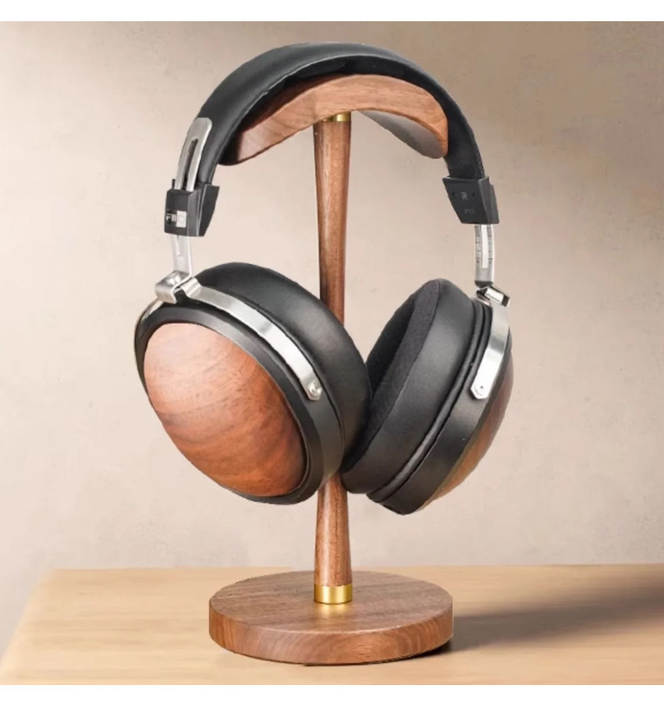 Uniwersalny i stylowy stojak biurkowy na słuchawki, wyróżniający się składaną konstrukcją w całości wykonaną z litego drewna orzechowego, podstawą z podkładką antypoślizgową oraz profilowaną podporą w kształcie łuku, chroniącą pałąk słuchawek przed deformacją.