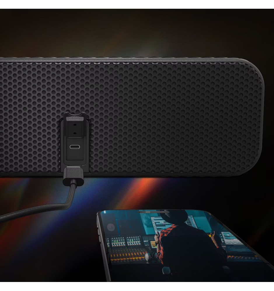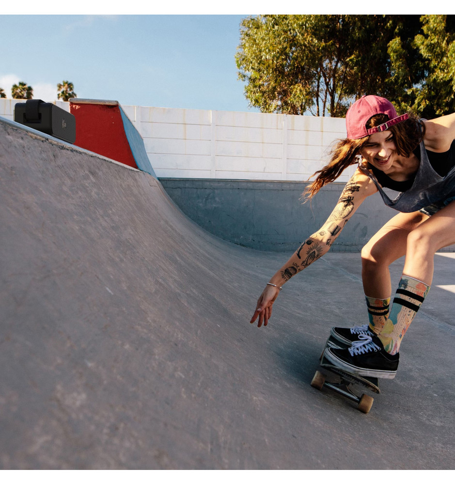 Wbudowany mikrofon pozwala na prowadzenie rozmów, bez konieczności rozłączania telefonu. Odłączany elastyczny pasek ułatwia transportowanie głośnika oraz pozwala na jego przymocowanie np. do plecaka, torby czy kosza piknikowego.