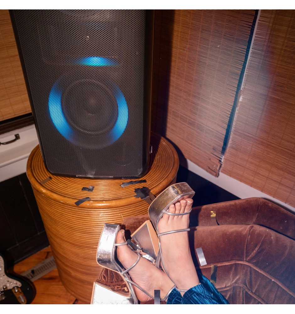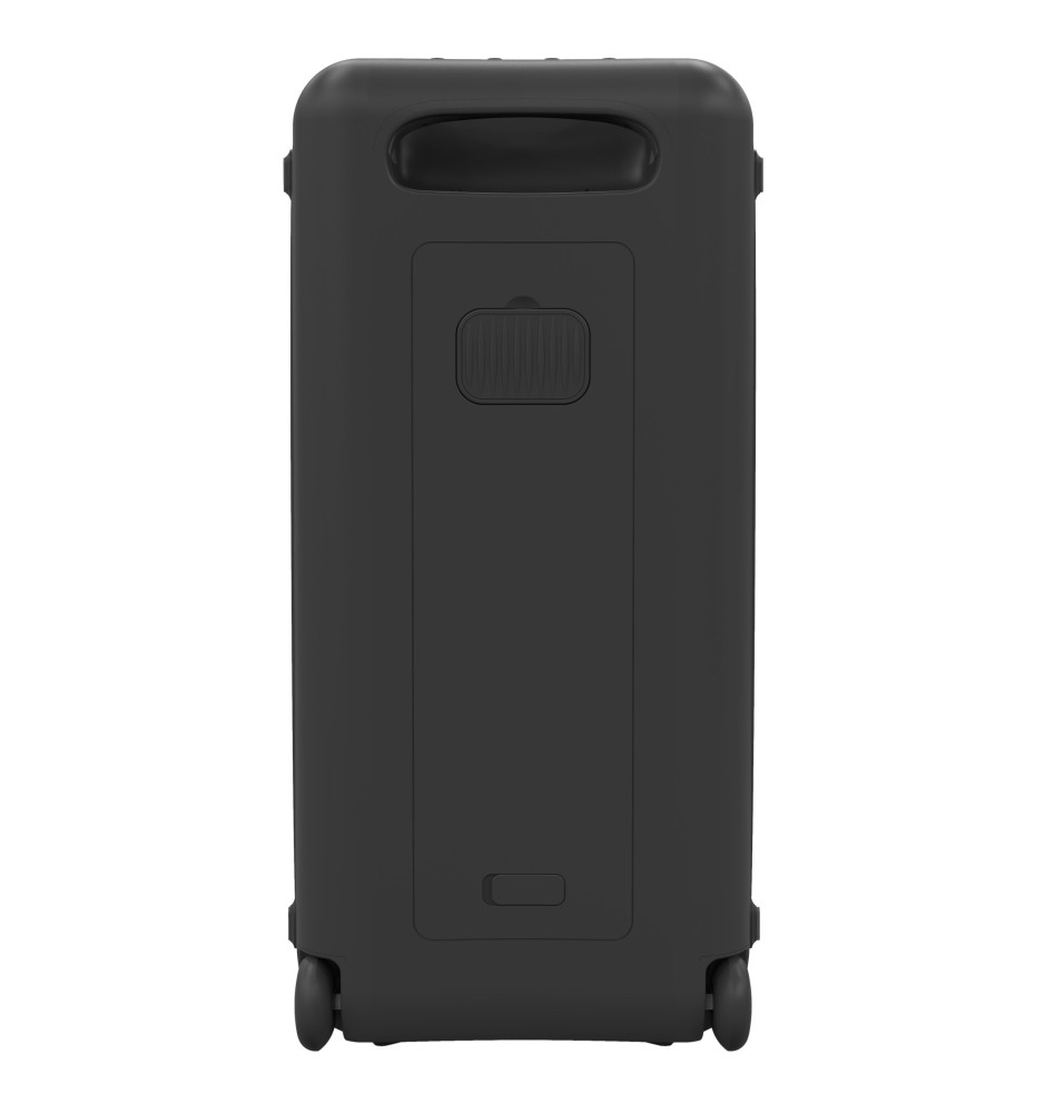 Obudowa głośnika posiada klasę odporności IPX4, co oznacza odporność na zachlapania, idealną na imprezy plenerowe. Wbudowane kółka transportowe oraz uchwyt ułatwiają przemieszczanie urządzenia. Wbudowany akumulator litowy zapewnia do 12 godzin odtwarzania bez efektów świetlnych lub 9 godzin z włączonymi światłami, umożliwiając całonocną zabawę bez przerwy.