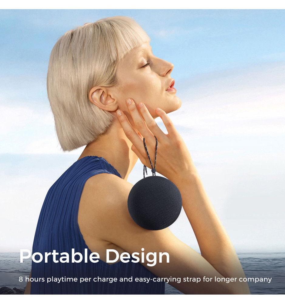 Wbudowana pojemna i trwała bateria litowo-jonowa w połączeniu z energooszczędną technologią Bluetooth 5.0 pozwala na nawet 8 godzin pracy głośnika po jednym naładowaniu. Jest wystarczająco mały, aby można było go zmieścić w kieszeni torby lub plecaka, a stopień ochrony IPX5 gwarantuje bezpieczeństwo nawet podczas niespodziewanych opadów deszczu.