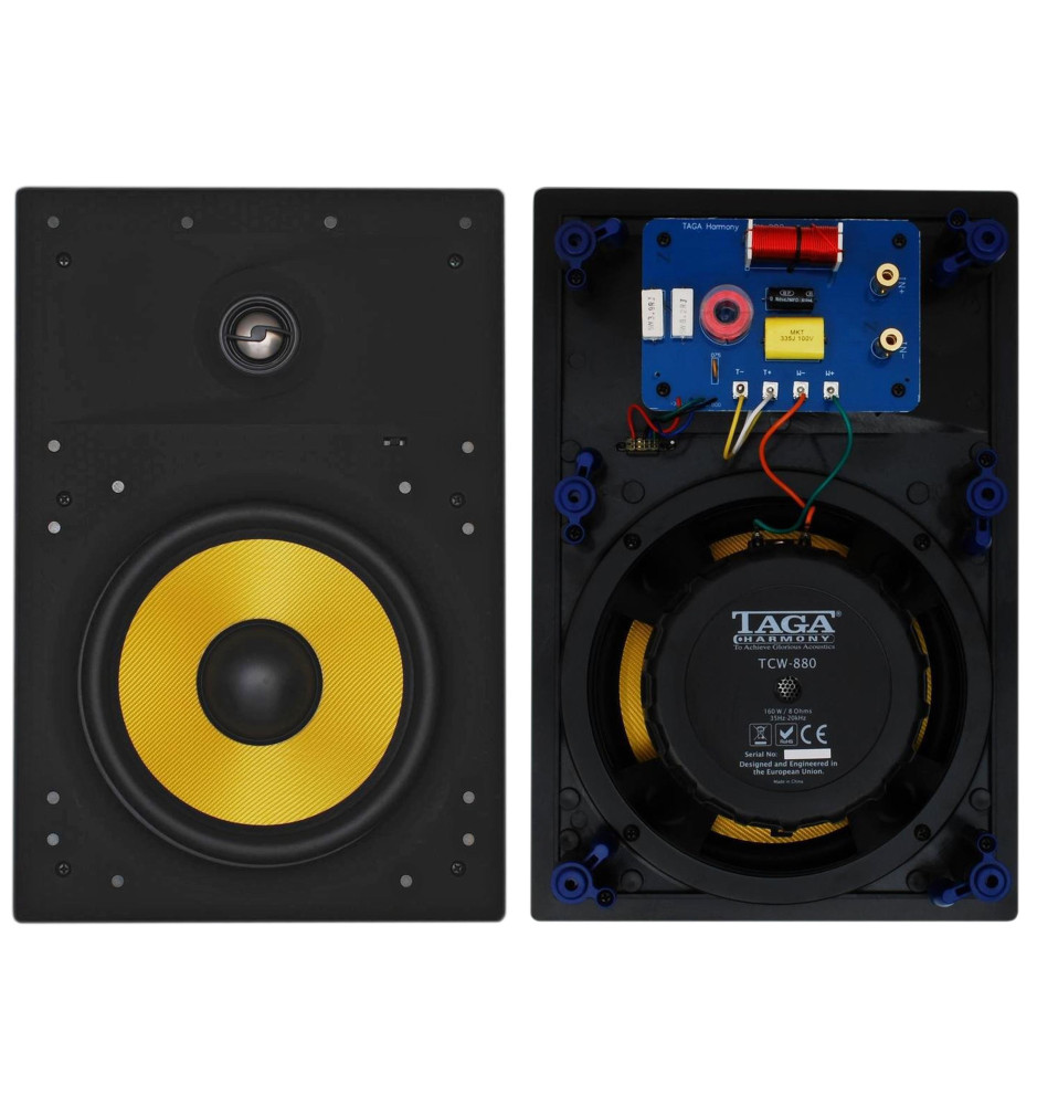 Głośniki TAGA Harmony TCW 880 posiadają płaskie, niskoprofilowe obudowy oraz magnetycznie mocowane maskownice, które można malować. Dzięki temu głośniki trudno dostrzec w ścianie czy suficie. Aby ułatwić podłączenie głośników producent zdecydował się na umieszczenie wysokiej klasy terminali głośnikowych, które akceptują wtyki bananowe oraz niekonfekcjonowane kable głośnikowe do 10AWG. Specjalne uchwyty i zaciski z ABS w jaskrawym kolorze sprawiają, że instalacja głośników jest niezwykle prosta.