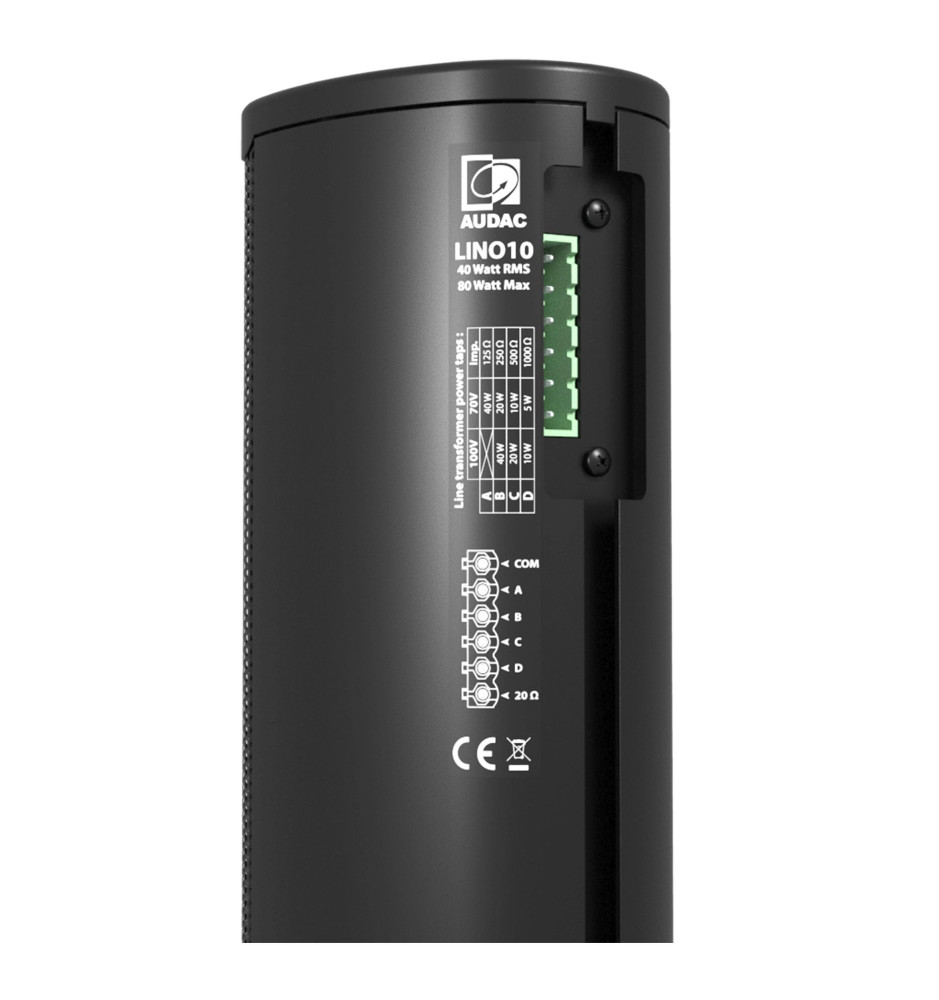Audac LINO4 składa się z czterech przetworników dwucalowych odpowiedzialnych za niskie i średnie częstotliwości oraz z centralnie umieszczonego 1-calowego tweetera odpowiedzialnego za wysokie częstotliwości. Głośnik osiąga moc 20 W, a wieloodczepowy transformator liniowy umożliwia podłączenie go do systemów nagłośnieniowych 70 V/100 V z odczepami mocy 20 W, 10 W i 5 W lub 2.5 W tylko w przypadku rozwiązań 70 V.