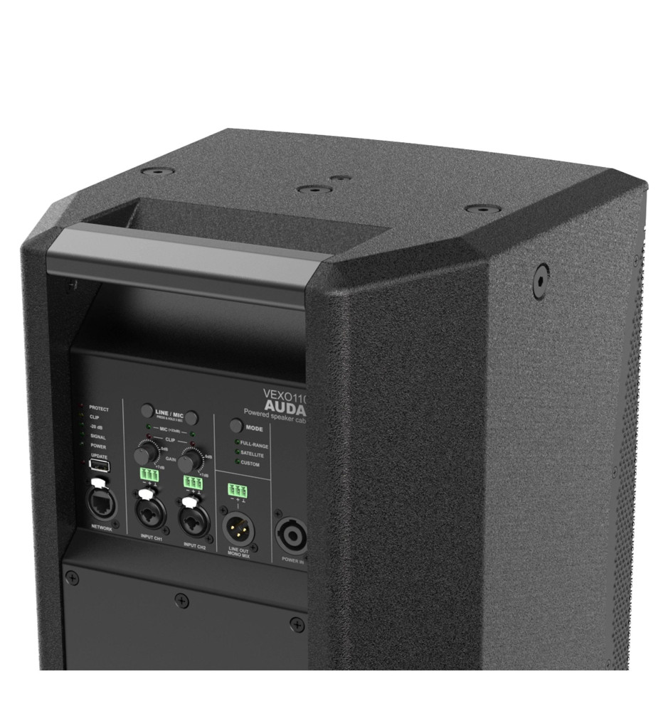 Wysoce wydajny aktywny głośnik dwudrożny. Unikalna kompozycja przetworników VEXO110A zapewnia czysty i naturalny dźwięk o mocy RMS na poziomie 300 W i maksymalnej mocy 1200 W. Dzięki procesorowi DSP technologia sterowania i przetwarzania dźwięku umożliwia każdemu użytkownikowi bezproblemową obsługę nawet najbardziej zaawansowanych konfiguracji akustycznych.