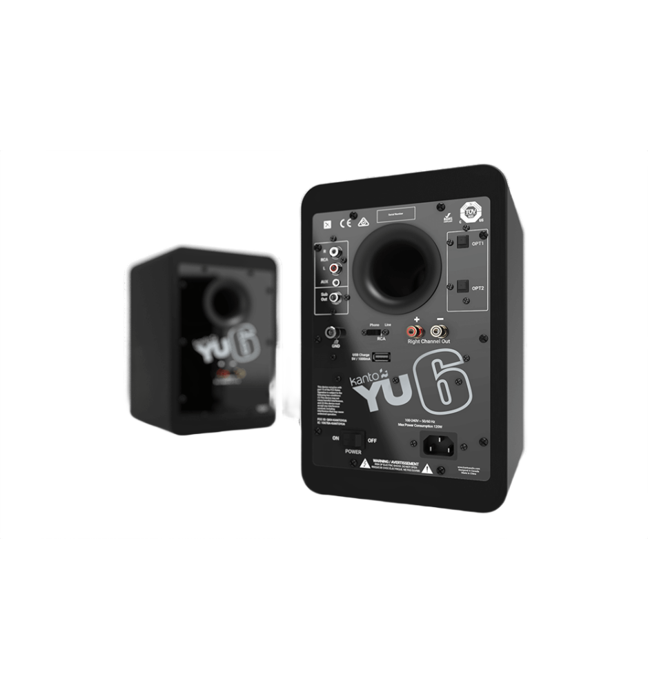 Kanto YU6 to kompaktowe głośniki aktywne o mocy 200 W, z przetwornikami Kevlar® i jedwabnymi kopułkami, oferujące pełny, klarowny dźwięk i łączność Bluetooth aptX oraz wejścia RCA, AUX i optyczne.