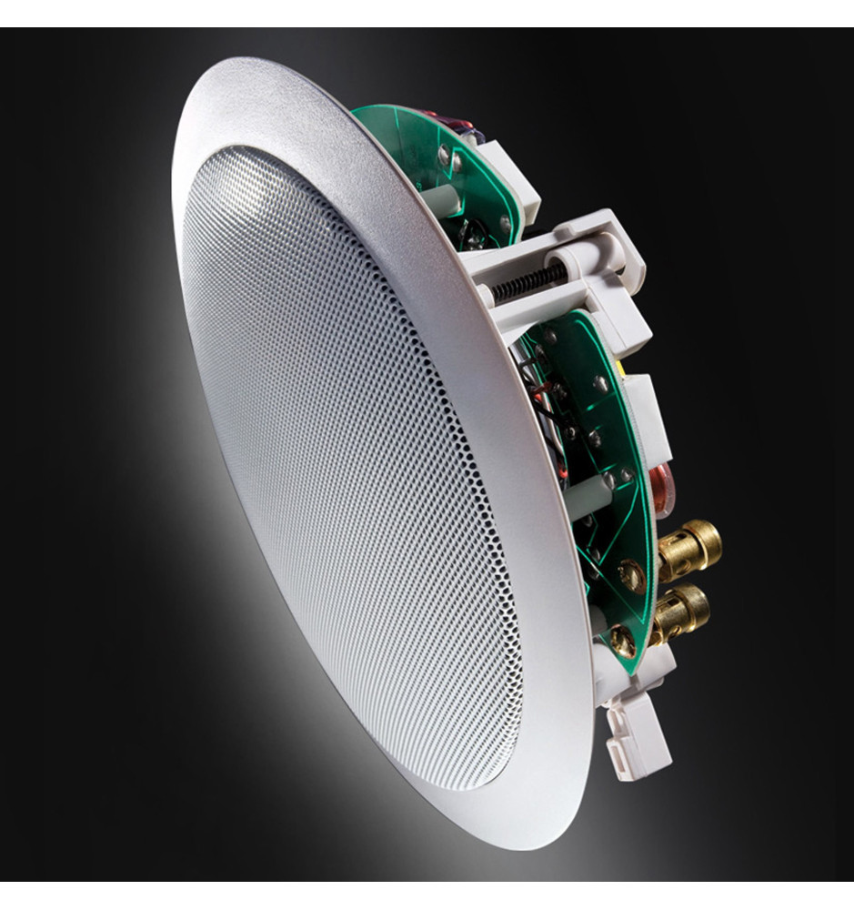 Zaawansowana zwrotnica APOC została ukryta pod ramką i zapewnia precyzyjne podziały częstotliwości, co wspiera stabilność barwy dźwięku nawet przy wyższych poziomach głośności. Specjalny mechanizm zaciskowy umożliwia szybkie i stabilne zamocowanie głośnika w suficie lub ścianie, a pozłacane zaciski śrubowe gwarantują trwałe połączenie przewodów.