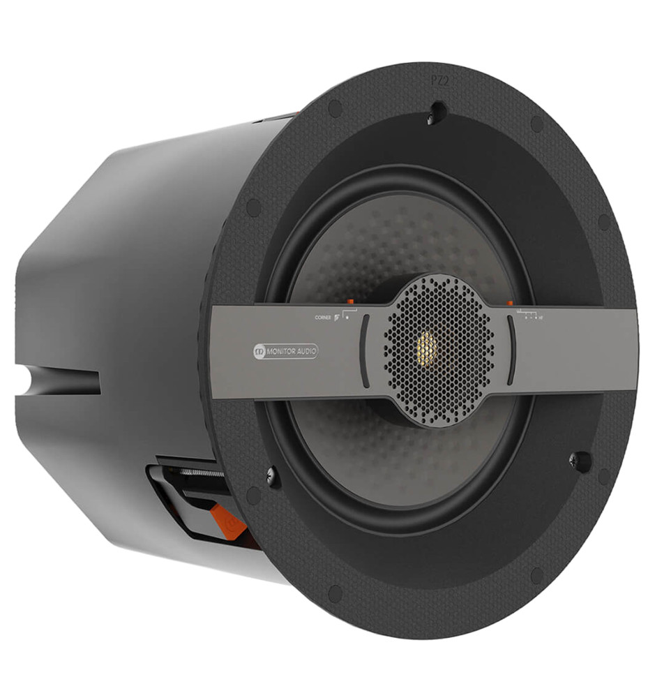 Średniej wielkości dwudrożny głośnik montażowy 2-poziomu z serii Creator od Monitor Audio w wersji Controlled Performance (CP) z zamkniętą tylną obudową, zapewniającą optymalny i spójny dźwięk, niezależnie od konstrukcji ścian.