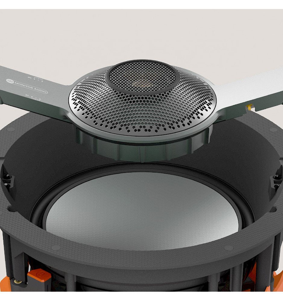 Duży głośnik montażowy 3-poziomu z serii Creator od Monitor Audio dedykowany do instalacji sufitowej i charakteryzujący się trójdrożną konstrukcją z trzema przetwornikami.