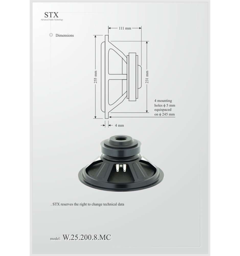 STX W.25.200.8.MC to wysokiej jakości głośnik niskotonowy renomowanej marki STX, przeznaczony do kolumn 3-drożnych wraz z wysoką skutecznością.