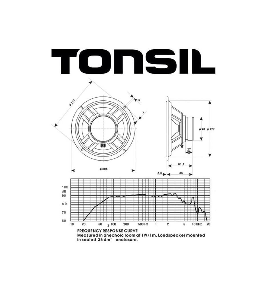 Głośnik Tonsil 20/40 8 Ohm wyposażono w kopułkę przeciwpyłkową, której głównym zadaniem jest ochrona cewki przed pyłkami, które mogą na niej osiadać. Dodatkowo kopułka przeciwpyłkowa usztywnia membranę zwiększając przy tym dynamikę brzmienia.Dane techniczne