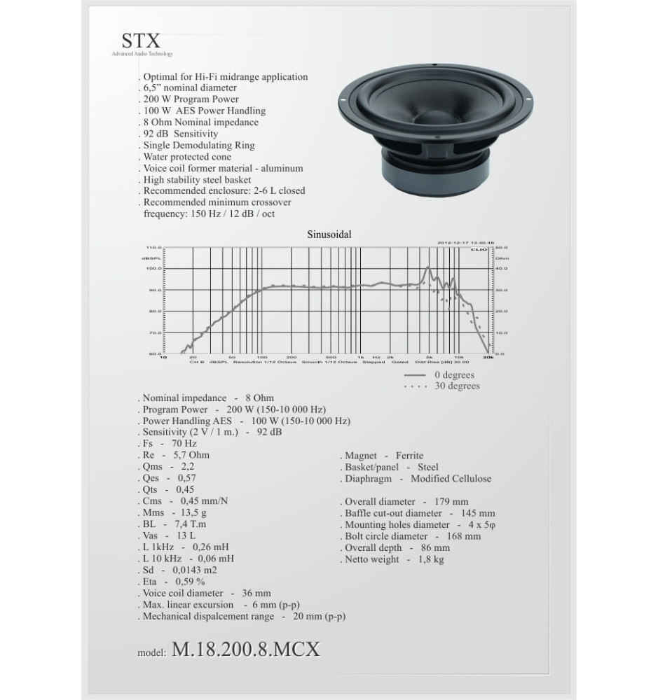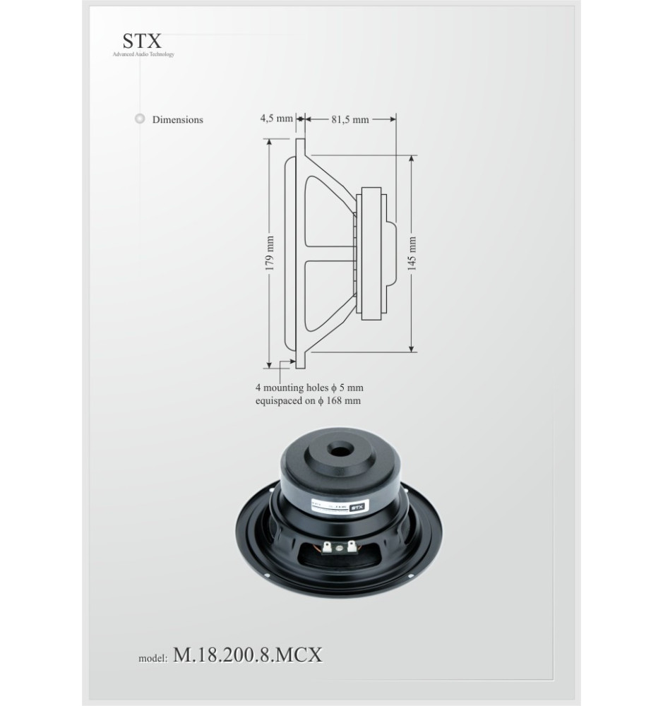 STX M.18.200.8.MCX to głośnik średniotonowy renomowanej marki STX, przeznaczony do systemów Hi-Fi, z otworem wentylacyjnym cewki gwarantującym mniejsze straty mocy.